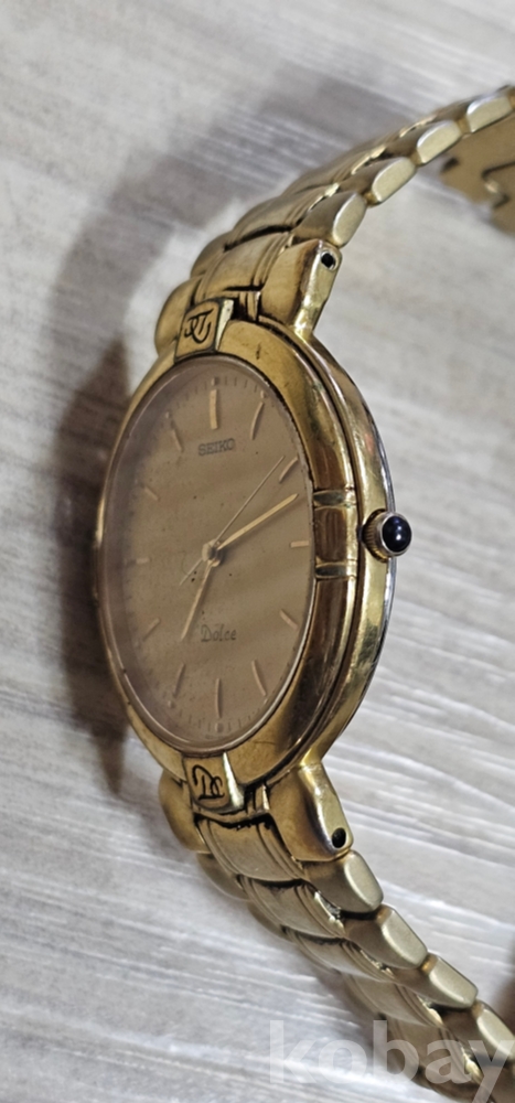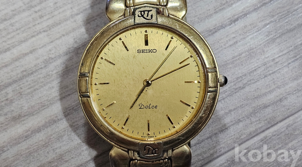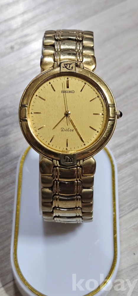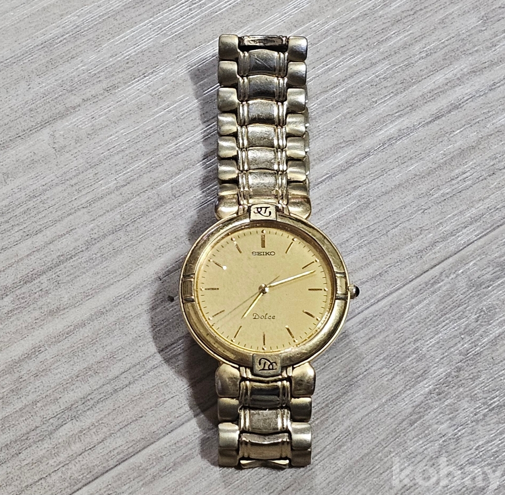 이미지는 금장 세이코 돌체 쿼츠 시계 있니다. 시계는 세련된 디자인과 고급스러운 금장 색상으로 특징입니다