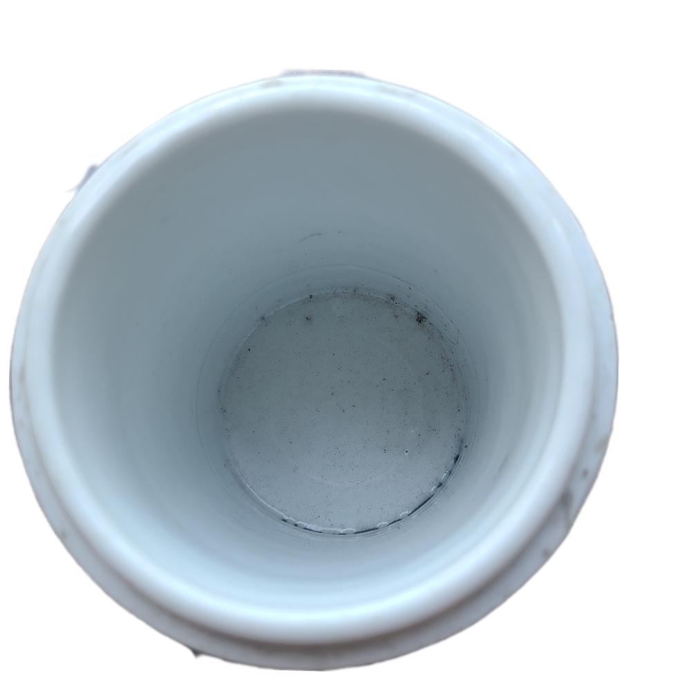 이 물품은 유백색 또는 연한 미색의 백자 또는 도자기 재질로 만들어진 원통형 용기입니다.