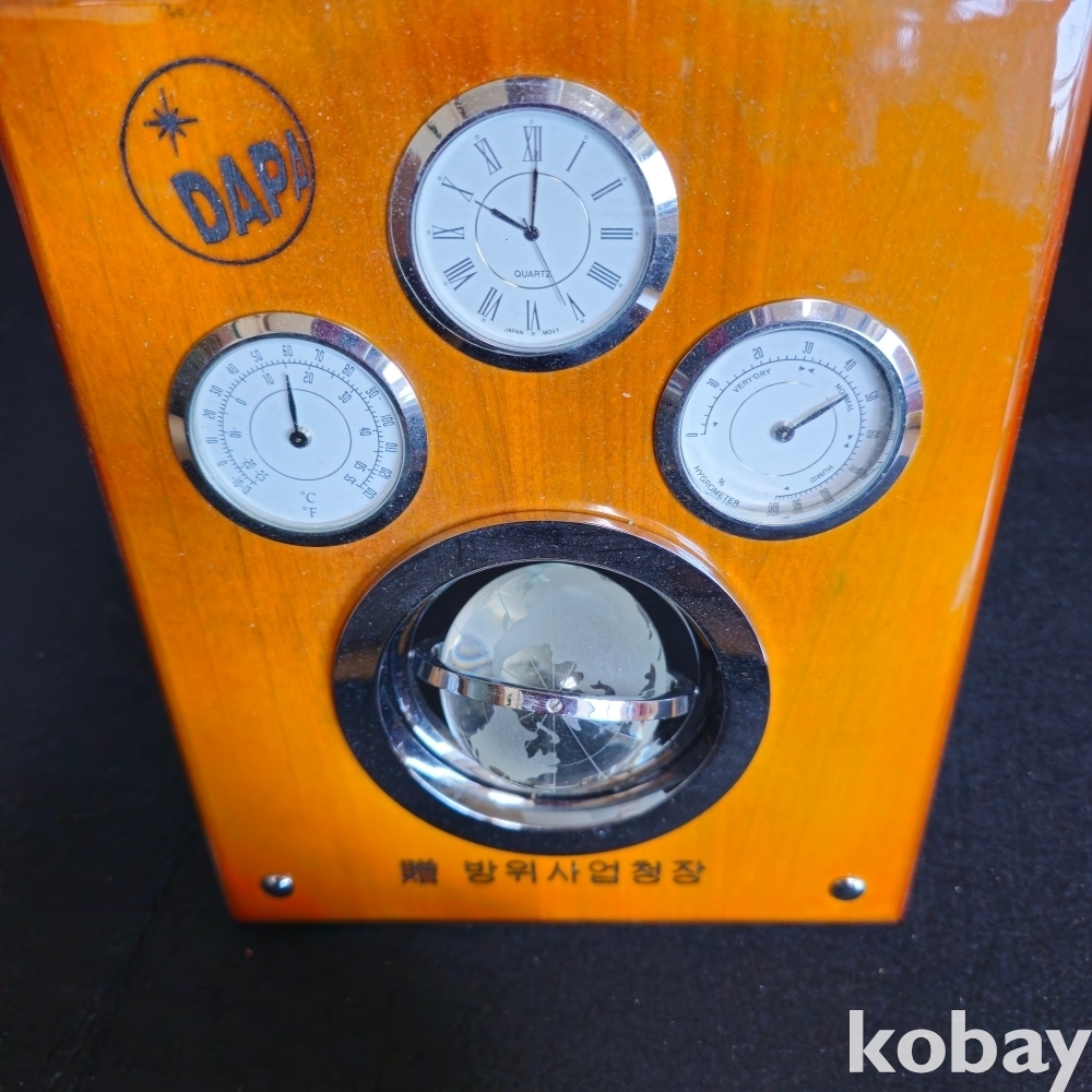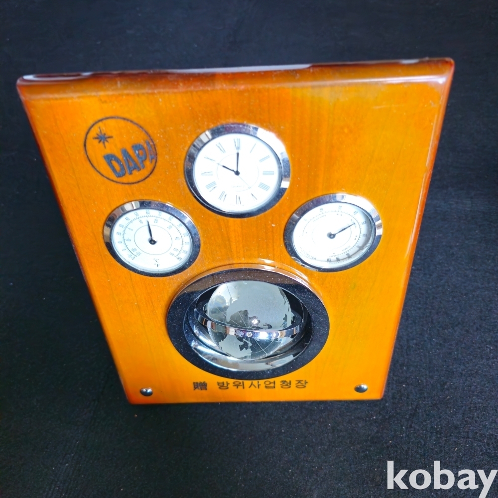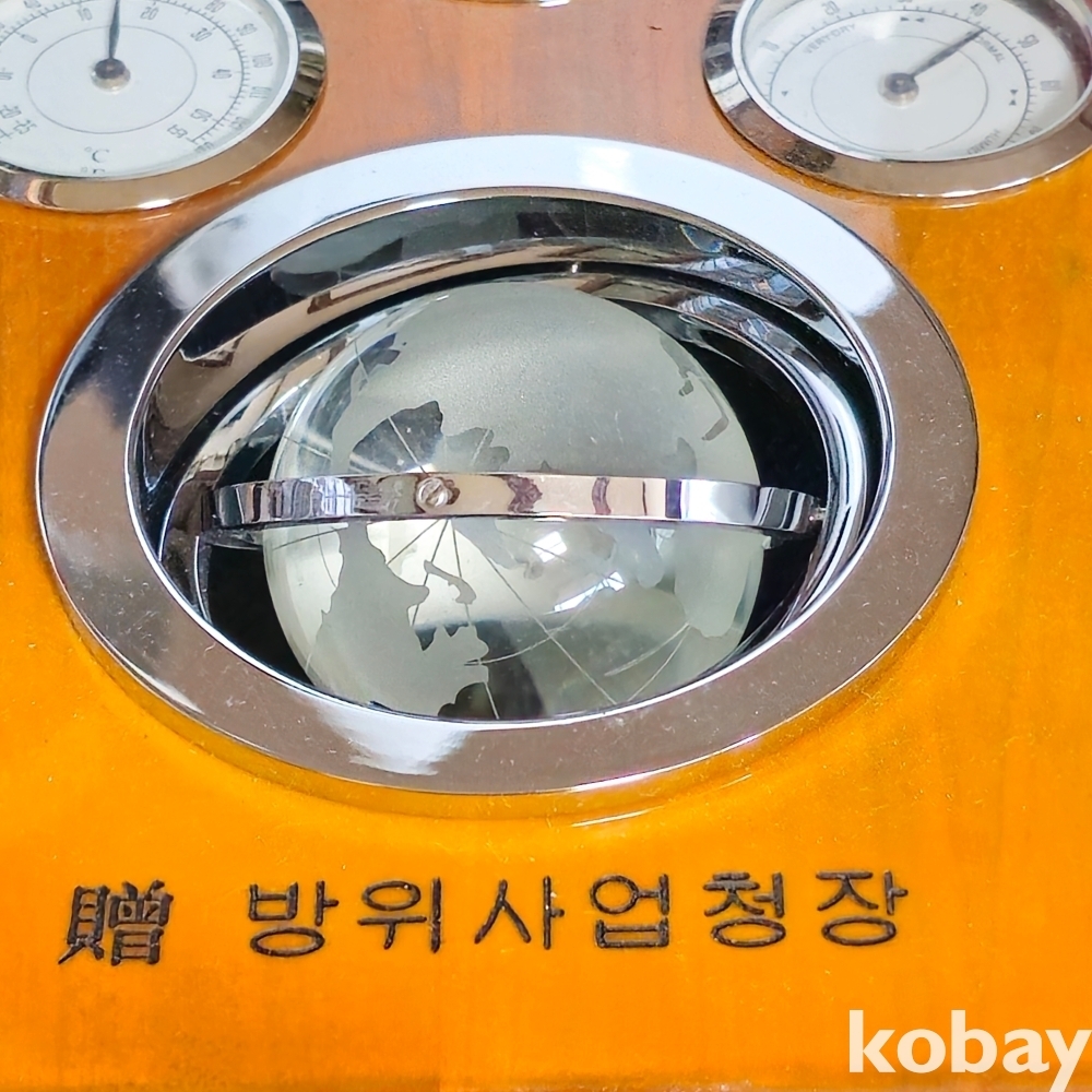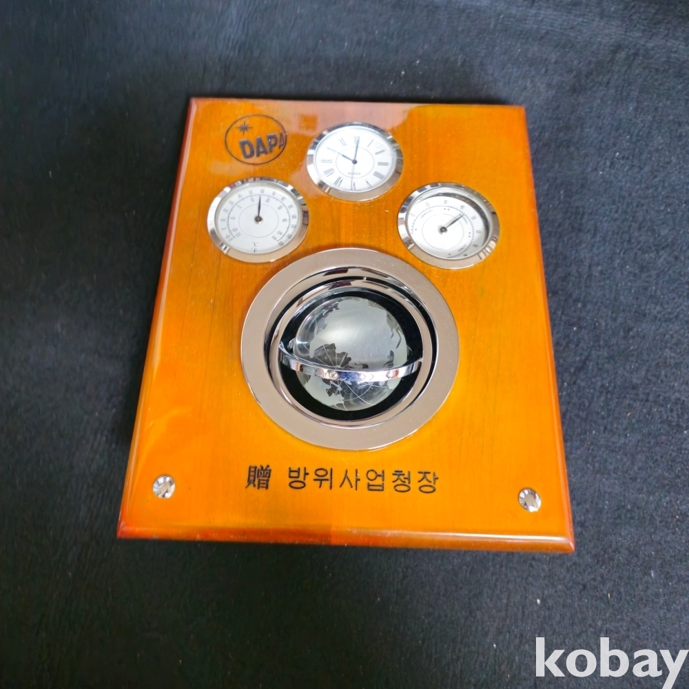 (((군자료/근현대사자료))) 오래전 시계와 온도계등부착 크리스탈 지구본이있는 방위사업청장증 원목기념품