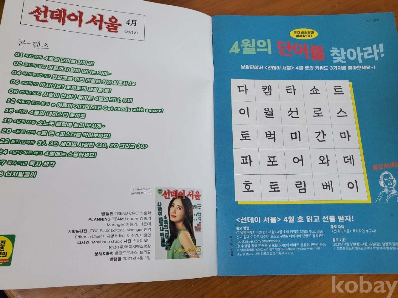 1. 선데이 서울 2021년 4월호, 이마트, 2021년, 28쪽, 월간, 비매품, 이마트 소식지, 표지 모델(가수 유미), 상태 상, 사진 참조