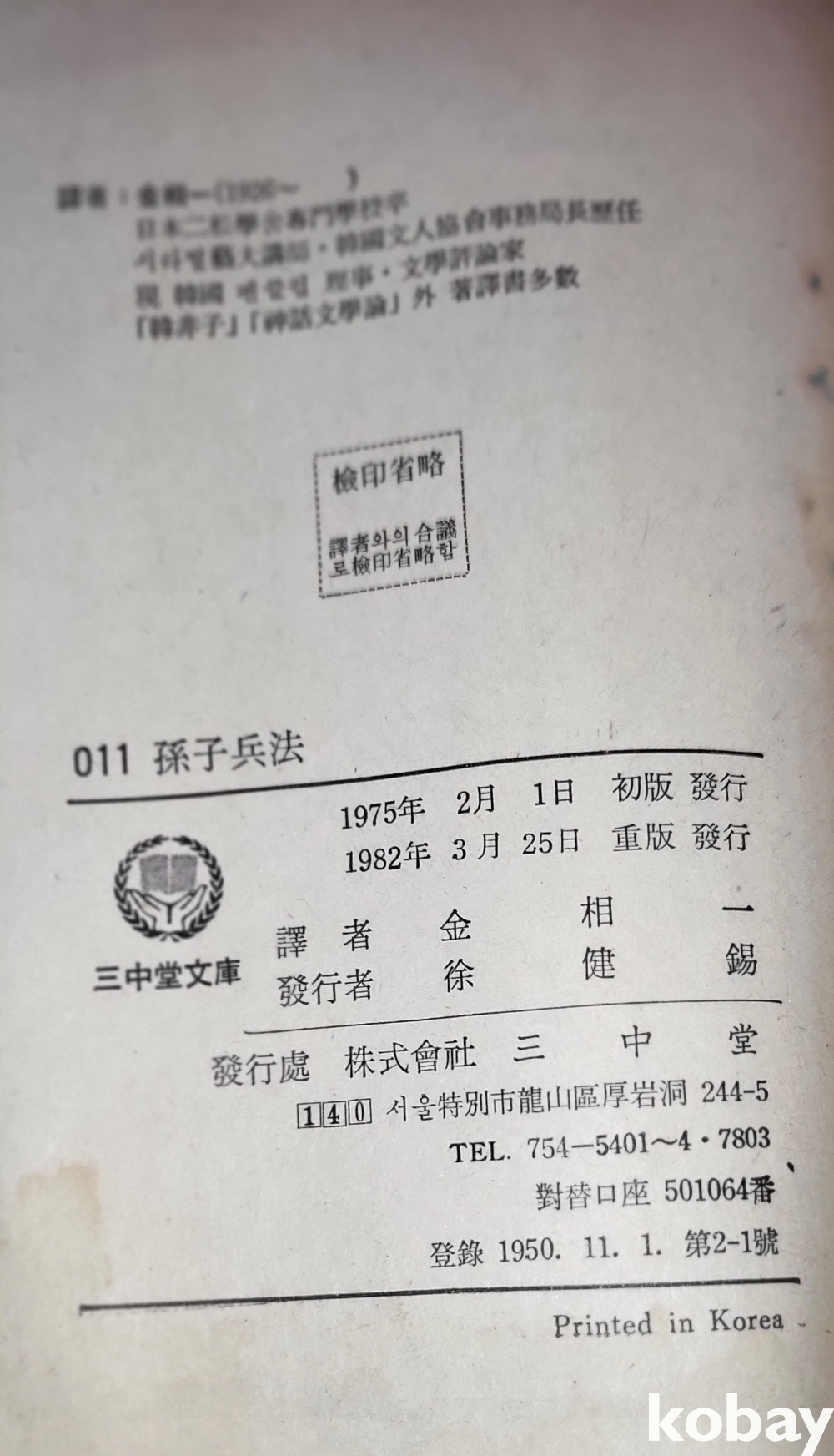 1982 년 삼중당문고 발간한 손자병법입니다,