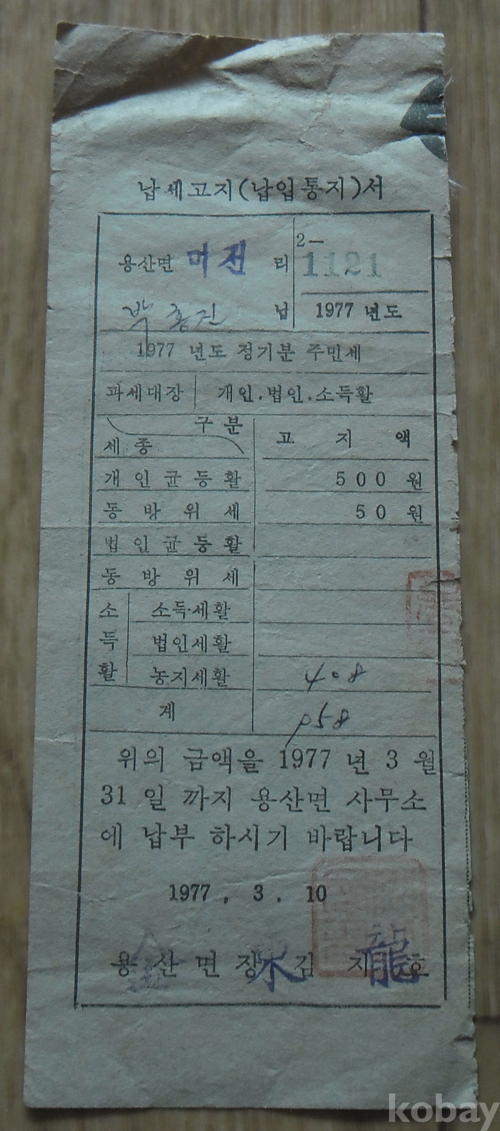1977년 영동군용산면 납세고지서