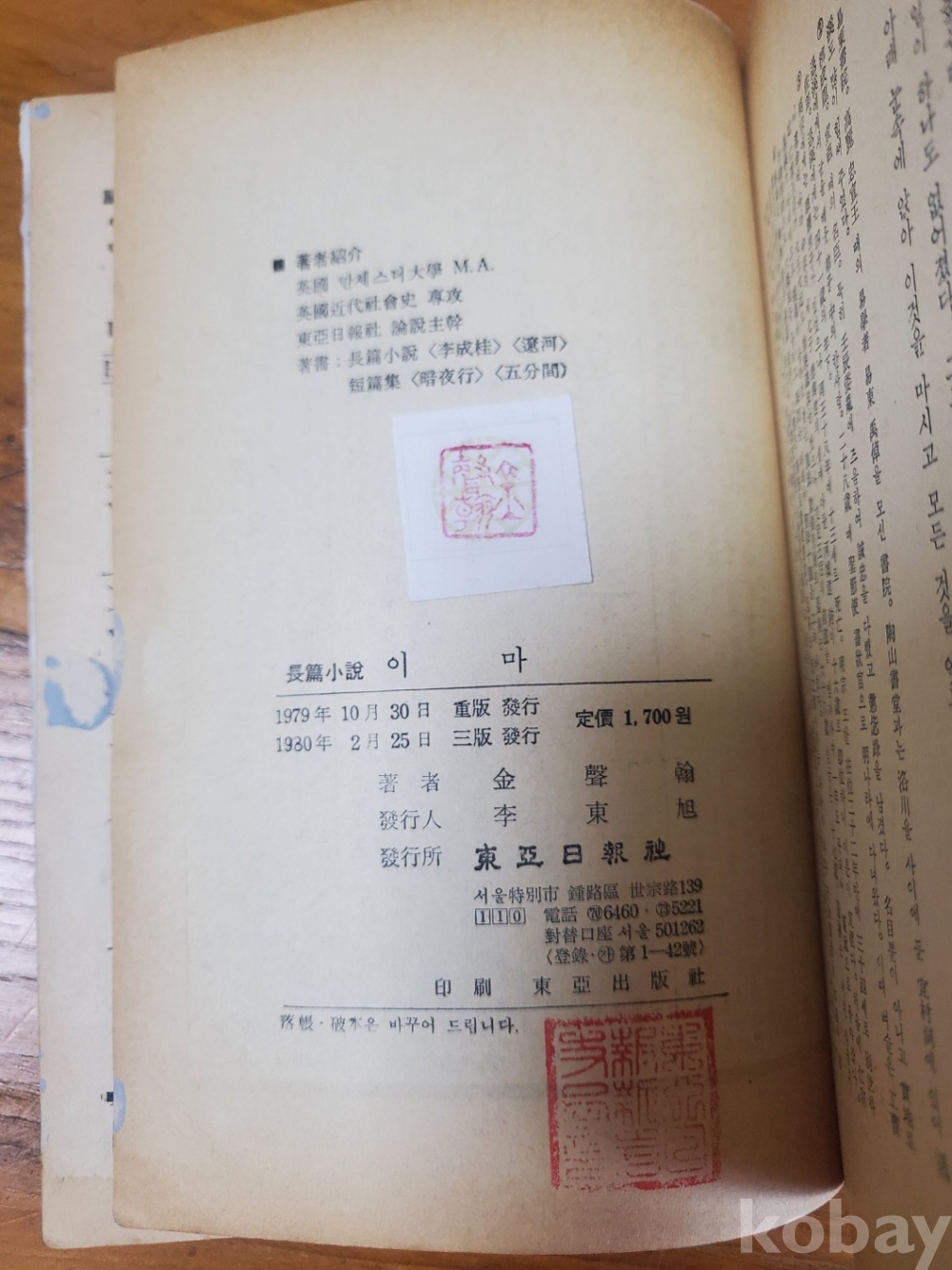 1. 이마, 김성한, 동아일보사, 1980년, 416쪽, 상태 중, 사진 참조