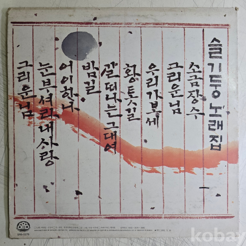 | 자켓상태 | VG : 주름, 접힘, 모서리 찢김 다수 | 음반상태 | VG : 생활 기스 다수, 가벼운 노이즈 존재 | 발매정보 | 초반 | 가사지여부 | 유 |