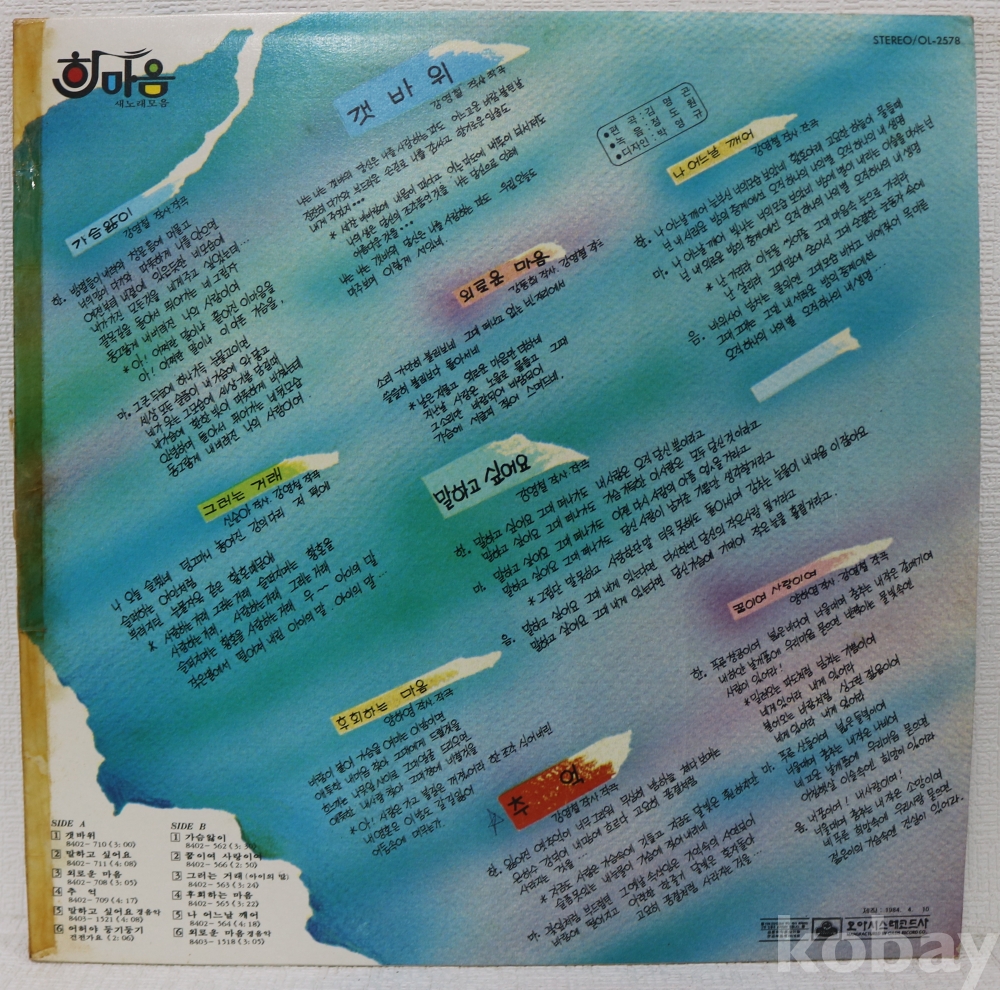 | 자켓상태 | VG : 주름, 접힘, 모서리 찢김 다수 | 음반상태 | VG : 생활 기스 다수, 가벼운 노이즈 존재 | 발매정보 | 초반 | 가사지여부 | 유 |