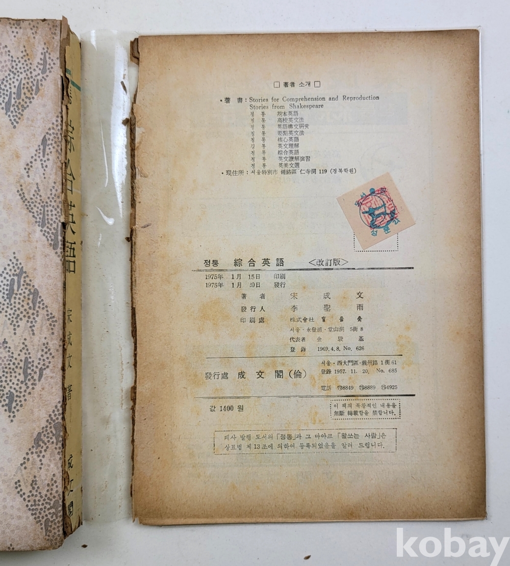 물 품 명 | 정통 종합영어 / 1975년 초판 : '75 개정판 / 송성문 / 성문각 |