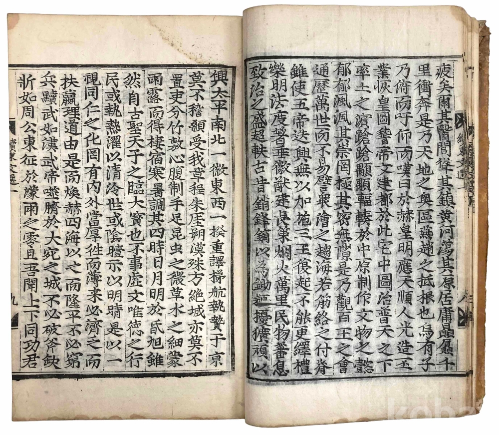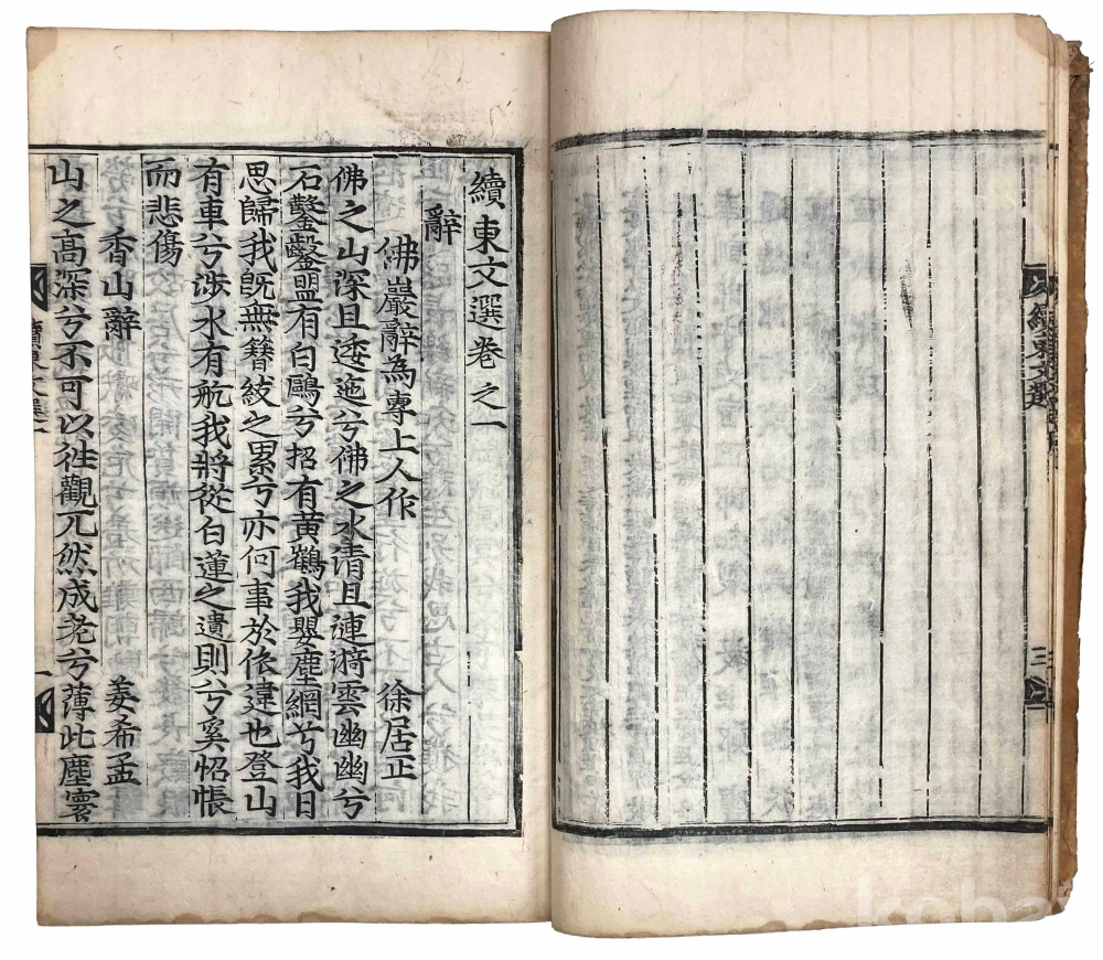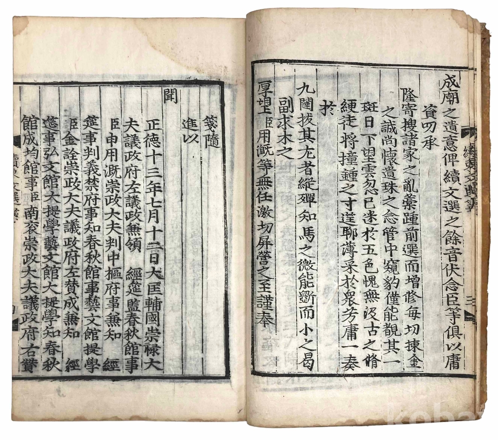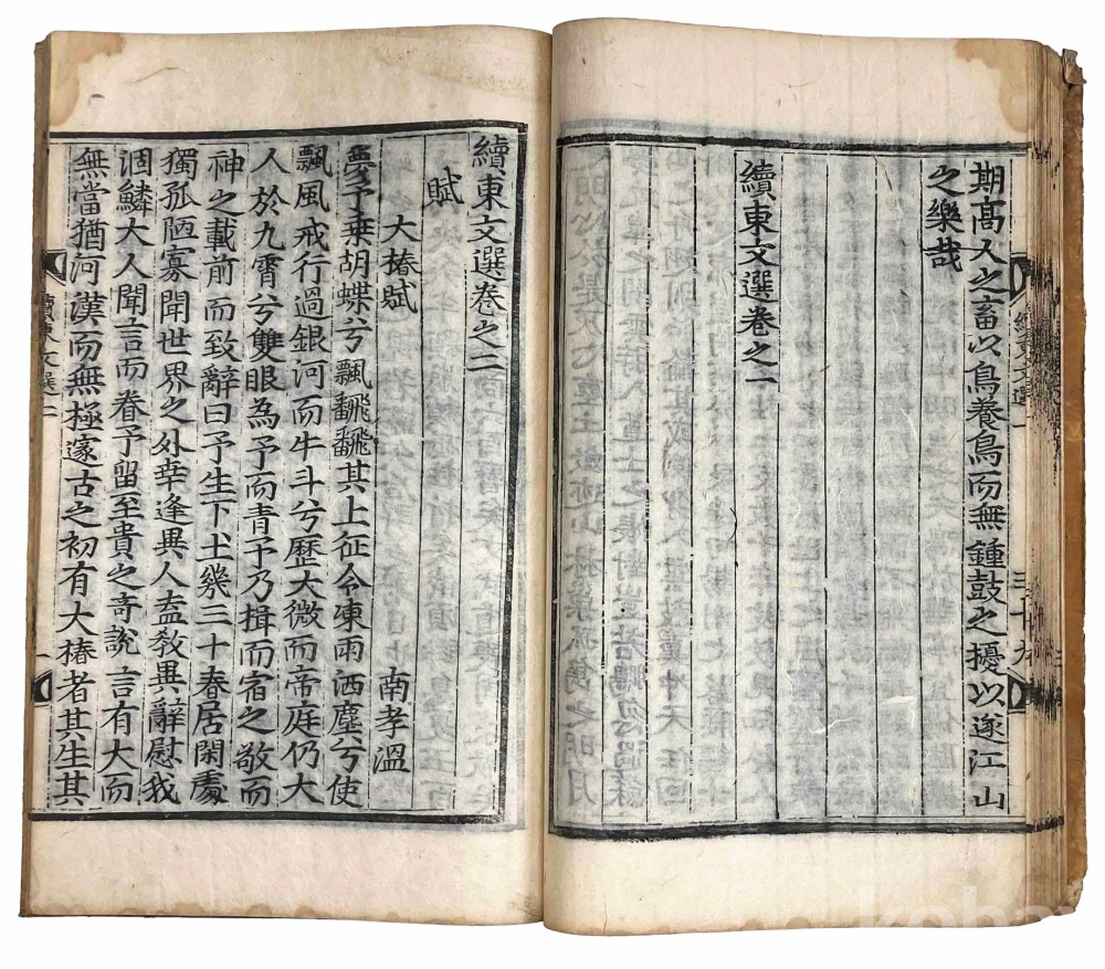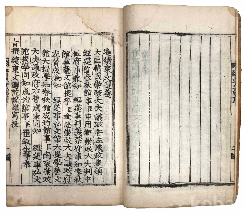 첫 장에 3개의 장서인이 찍힌 훈련도감자 번각본 『속동문선』 권1~2 1책입니다. 같은 질(秩)의 다른 책 표지를 보면 강희 21년(1682) 관문서를 표지로 재활용한 흔적이 있으므로 최소 1682년에 간행된 것으로 추측됩니다.『속동문선』 권1~2는 서(序)와 전(箋)이 처음 나오고, 그 다음에 찬집전후관(撰集前後官)과 권1, 권2로 이어집니다.
