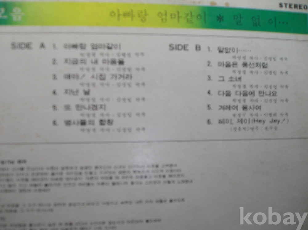 | 자켓상태 | VG : 주름, 접힘, 모서리 찢김 다수 | 음반상태 | EX : 재생에 영향 없는 가벼운 기스 존재 | 발매정보 | 알수없음 | 가사지여부 | 유 |