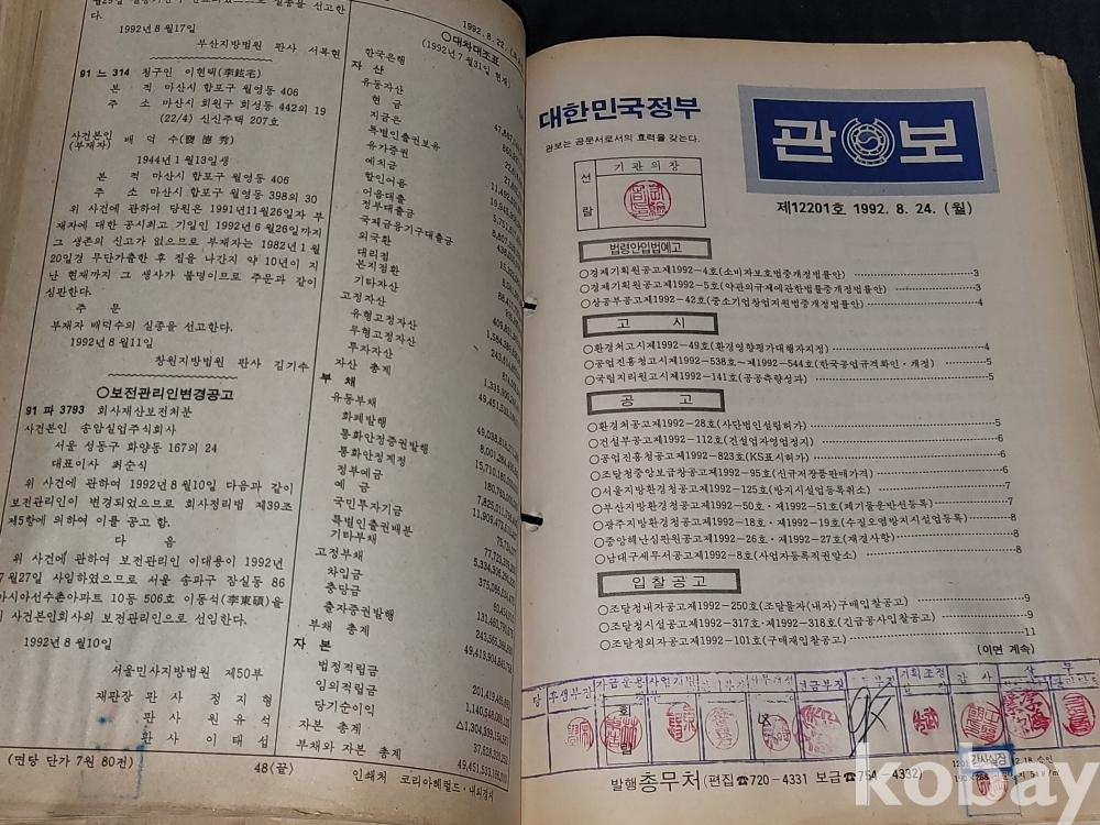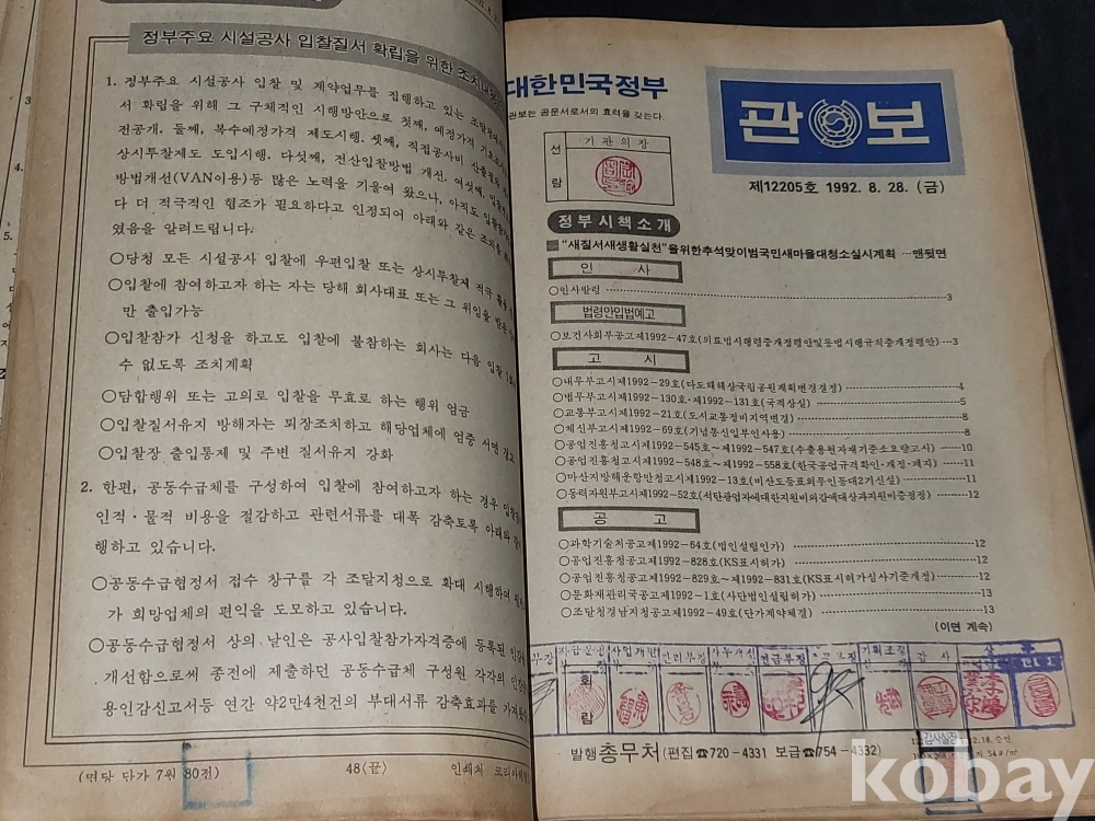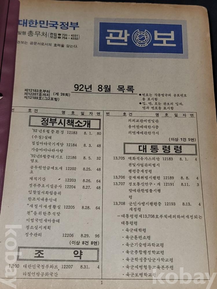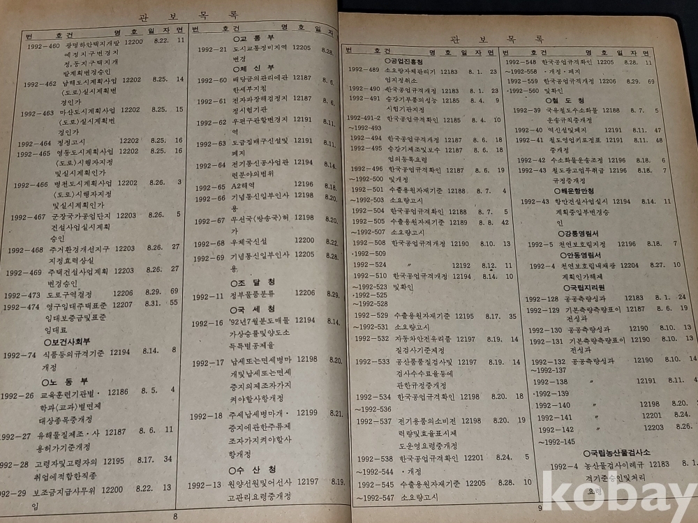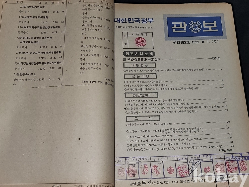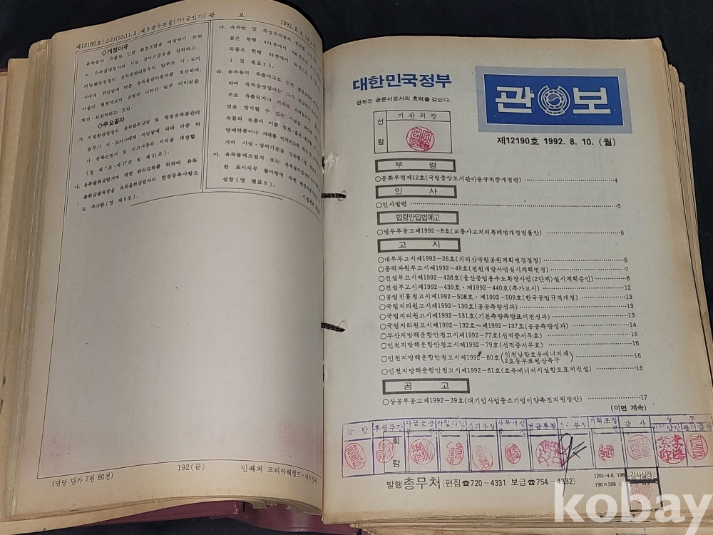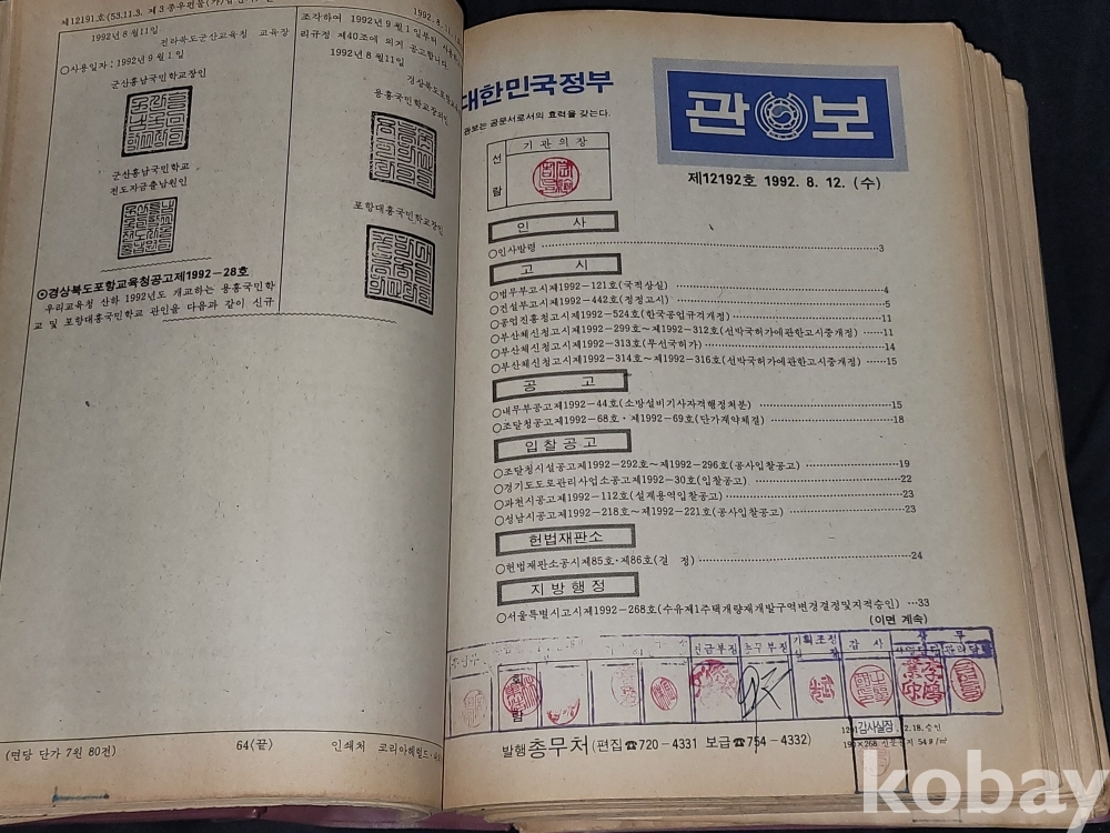 빈티지 세월 감이 느껴지는 1992년 총무처 발행 엄청 두꺼운 대한민국 정부 관보 고서적입니다.