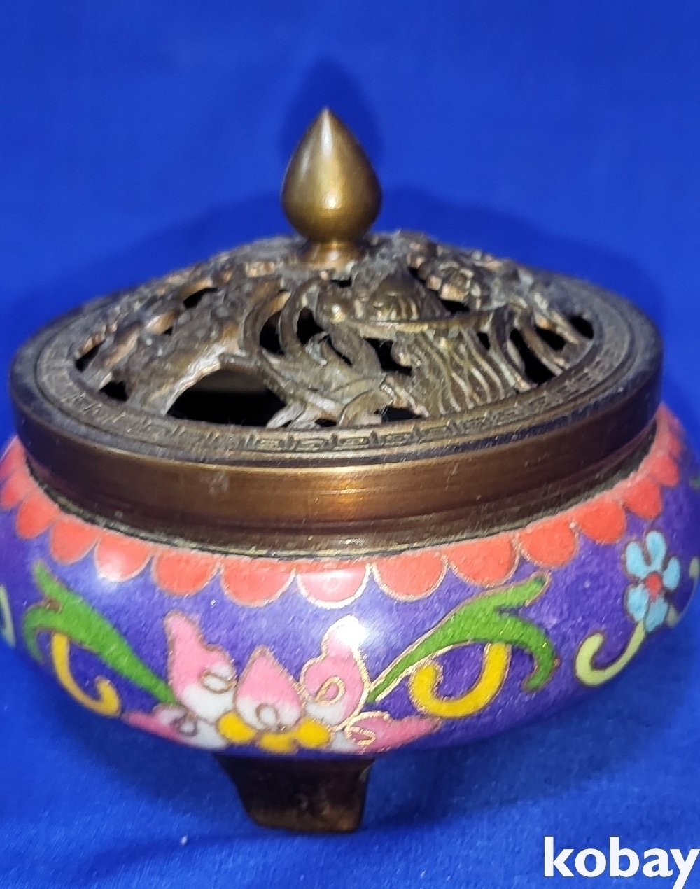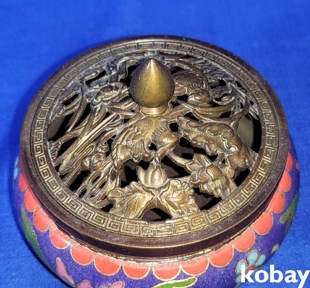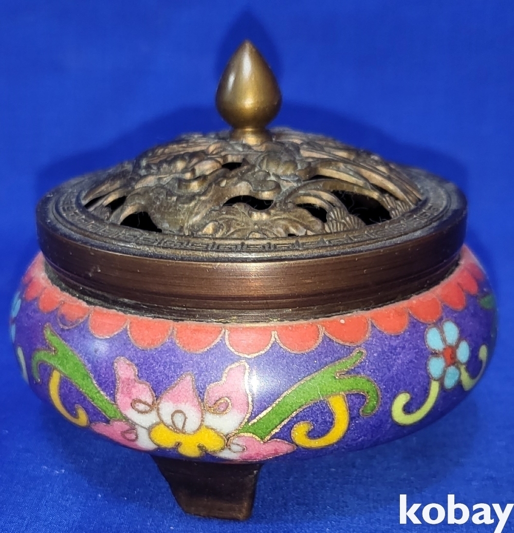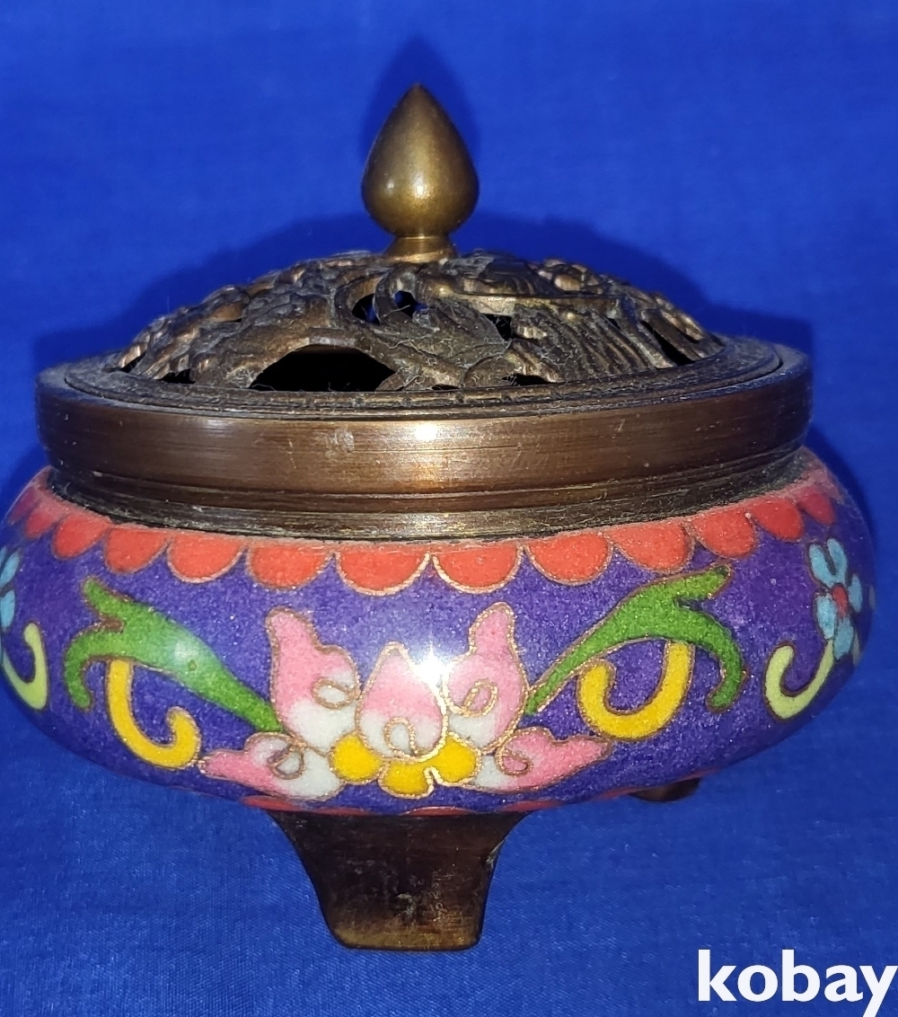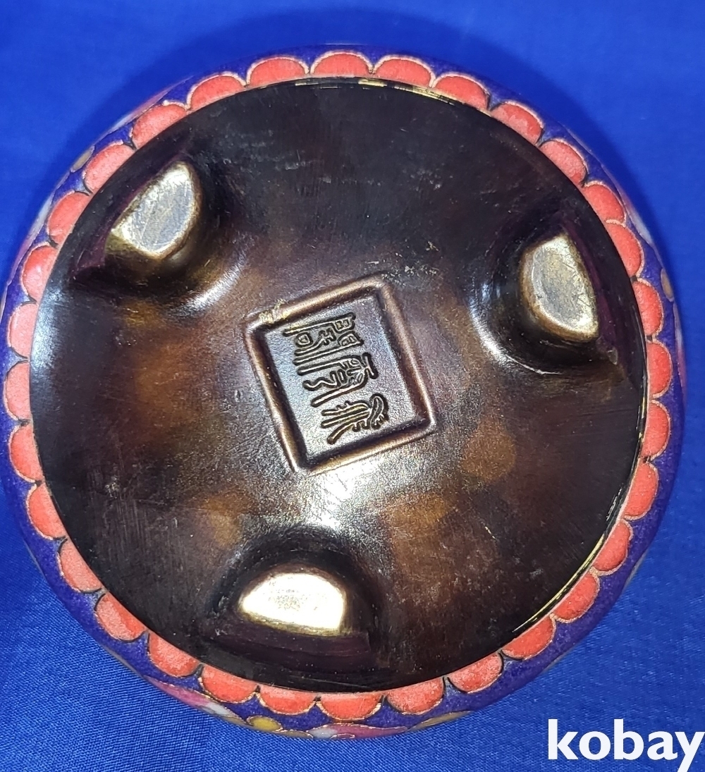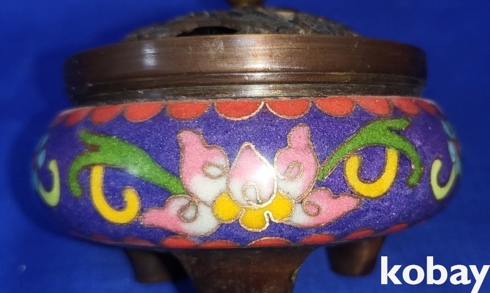 관지가 보이는 적동에 범랑 금채 화훼문 삼족 향로입니다