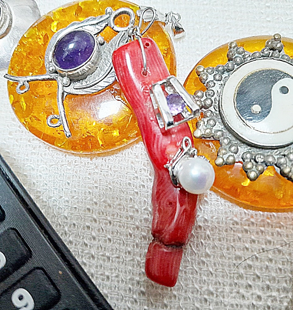 산호가지 진주 자수정 실버펜던트