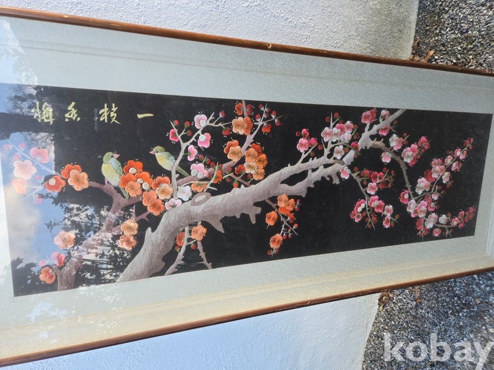 매화 꽃에 새 표현 자수 액자 입니다.