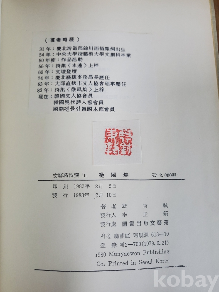 1. 미풍집, 금동식, 문예원, 1983년, 104쪽, 저자 서명본, 상태 상, 사진 참조