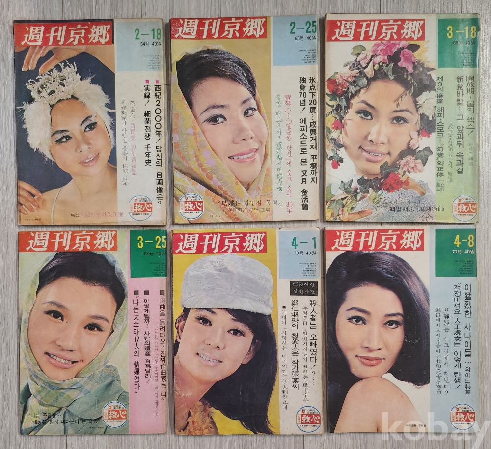 1970년도 주간경향 (가격40원) 6권 입니다 64.65.68.69.70.71호 입니다 당대에 연예인 광고 이슈거리들이 실려 있습니다 낙질 파본없이 상태 매우 양호합니다