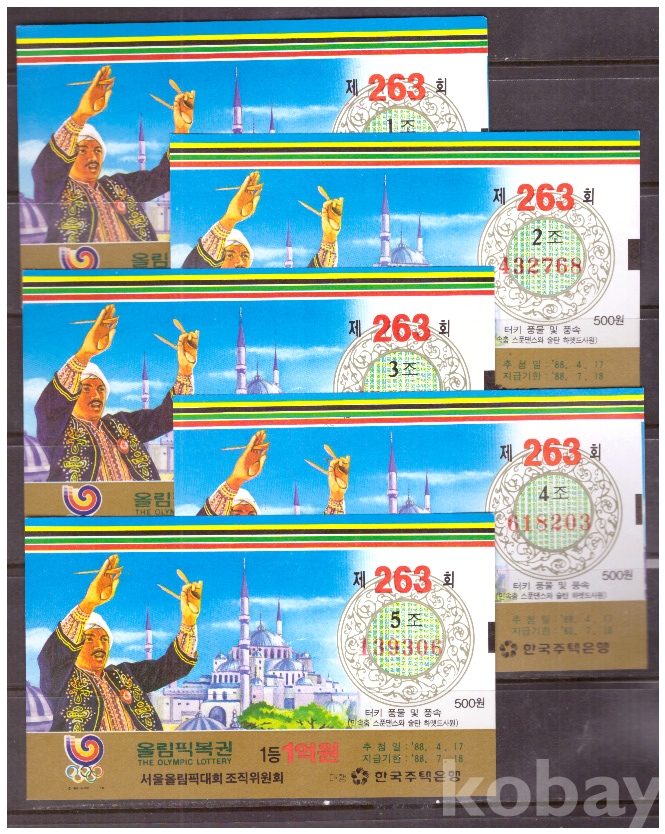 (서울올림픽) 1988 서울올림픽복권 제263회 1,2,3,4,5조 터키 풍물 및 풍속(민속춤 스푼댄스와 슐탄 하멧드사원)