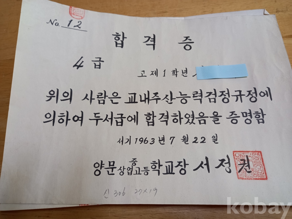 신 306) 양문중, 상업고등학교 주산능력 합격증 1963년