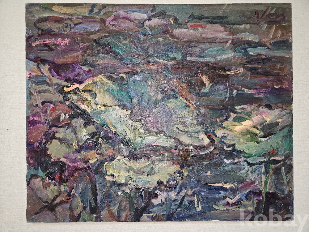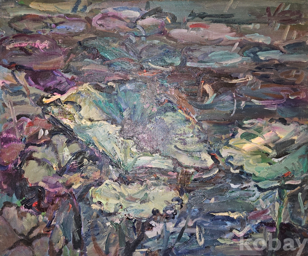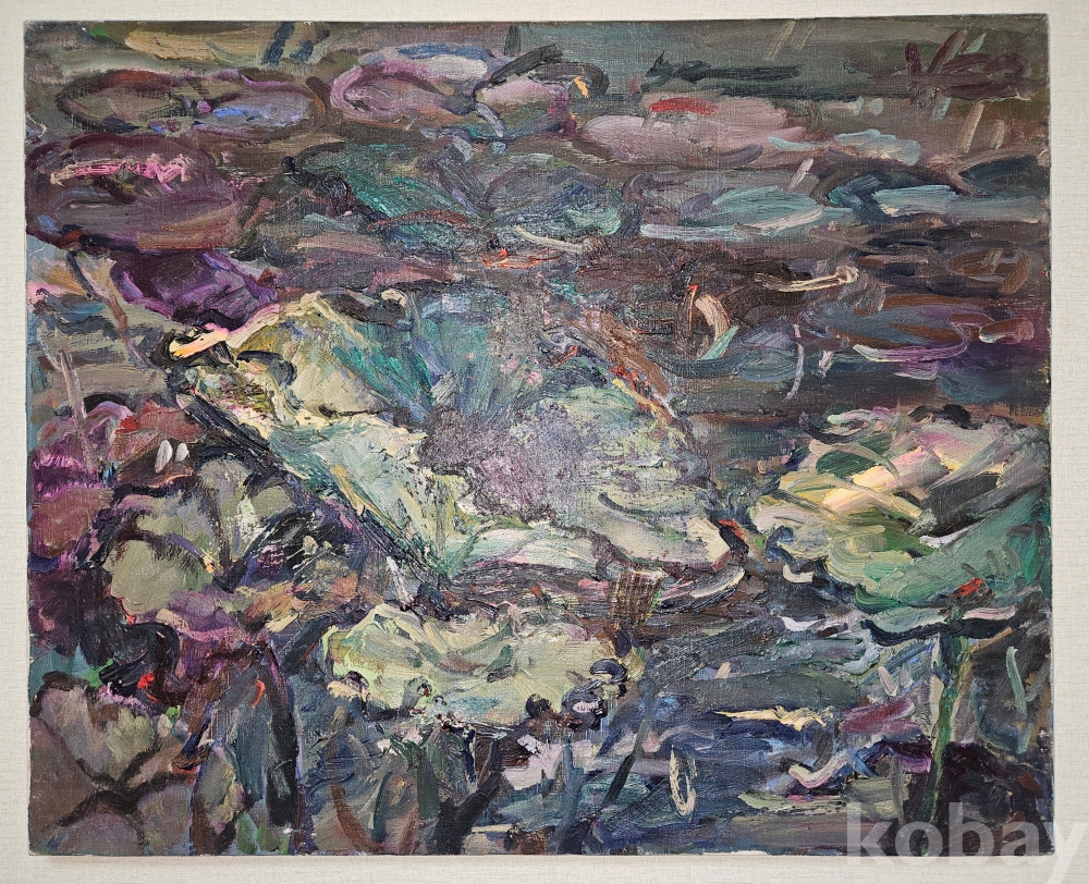 탁한 녹청·회보라·회백색은 연못의 깊이와 시간성을 암시합니다.