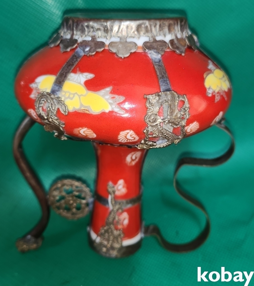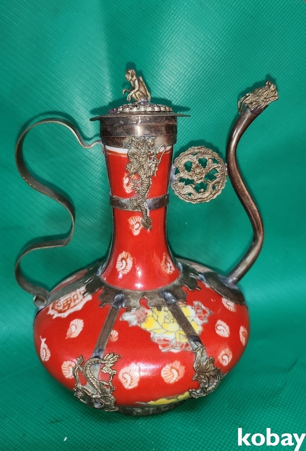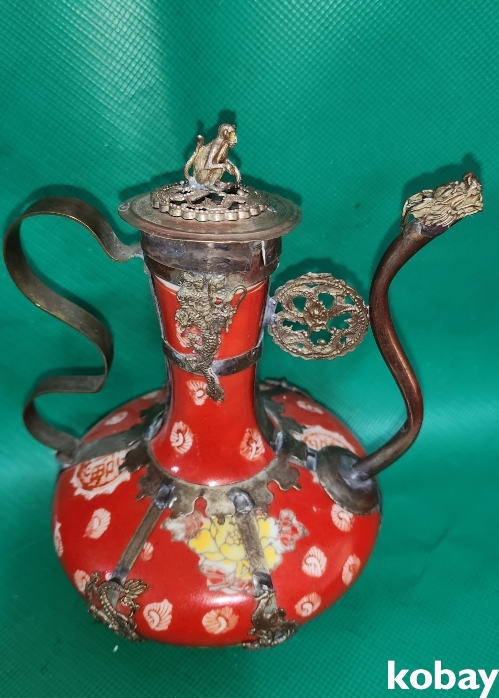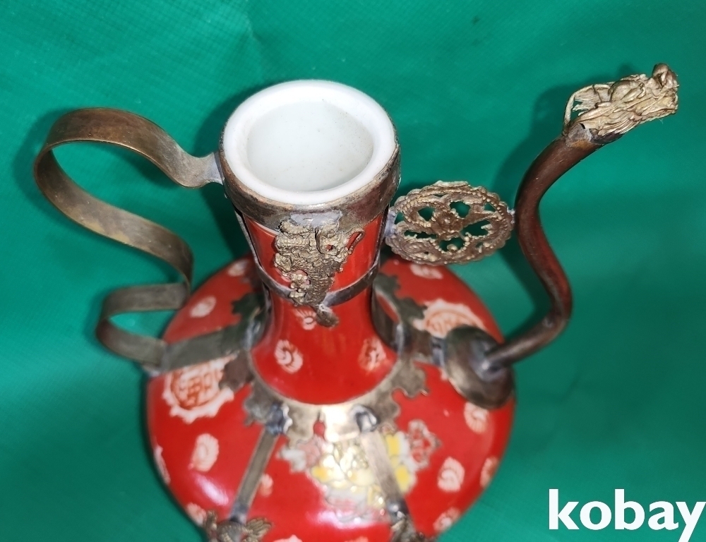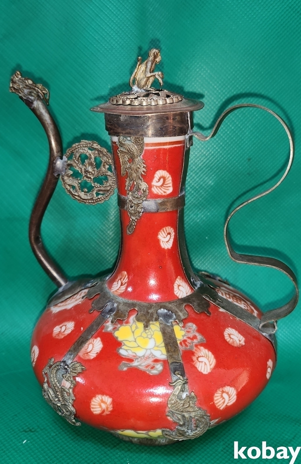 문은(文銀) 관지 갖춘 홍유에 수복(壽福) 꽃문양 주전자입니다,