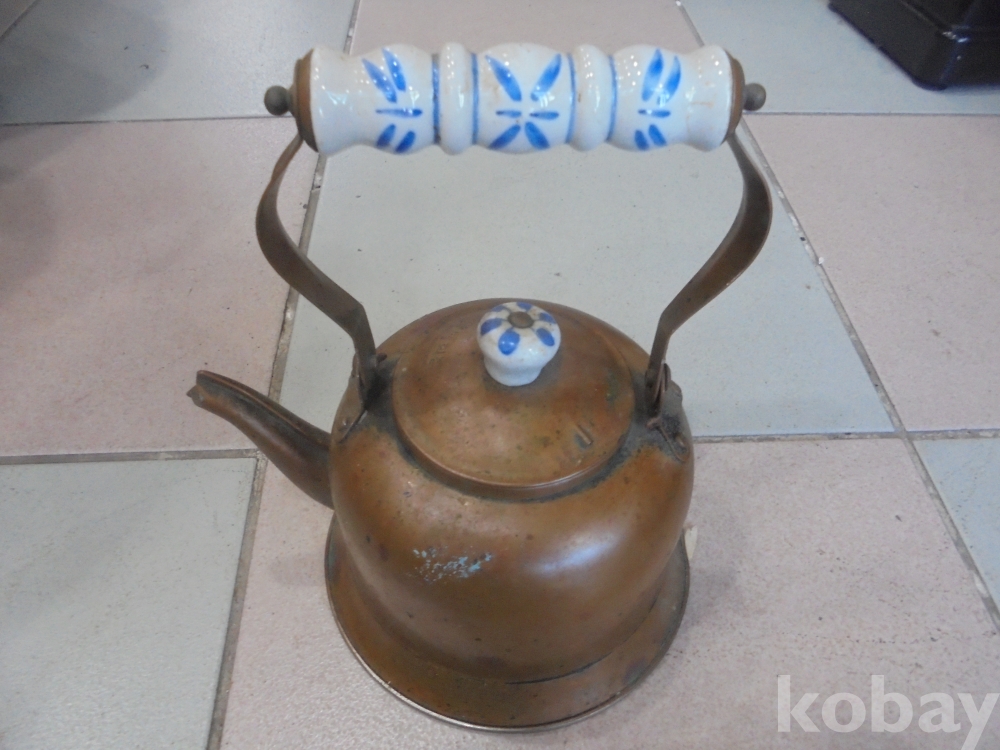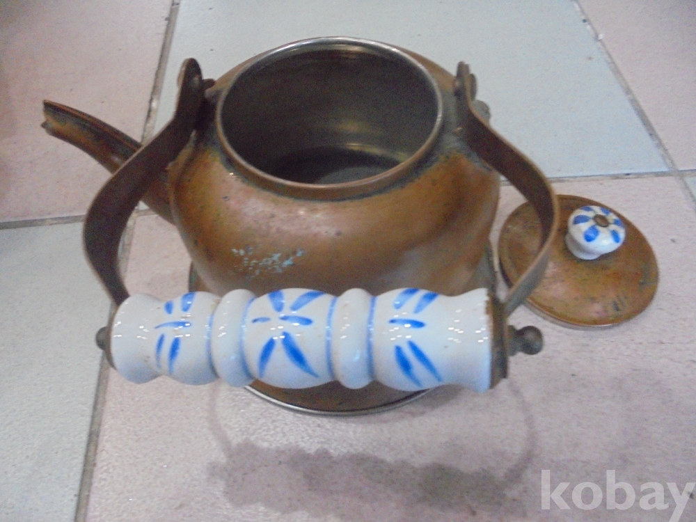 오래된 자석이붙지않는 완전구리주전자로 손잡이와 꽂지 청화백자로 열이차단되는 오래된 구리와 백자 손잡이주전자