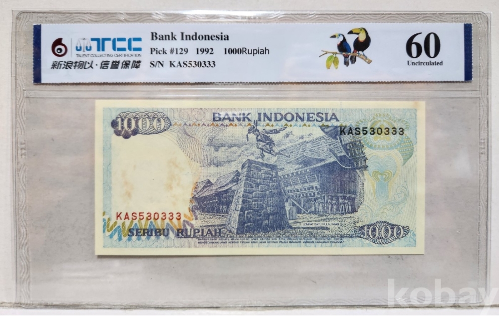 -1992년 인도네시아 1000루피아 지폐 TCC60 등급 입니다.