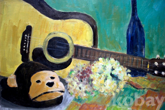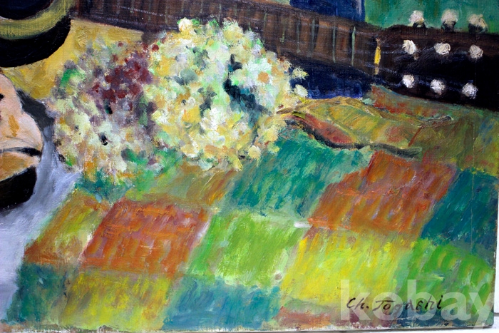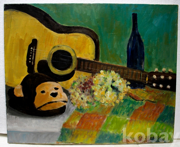 (유화) 일본작가 Ch. Togashi의 유화정물 (15 F) - 꽃과 기타, 와인, 원숭이탈이 있는 작품
