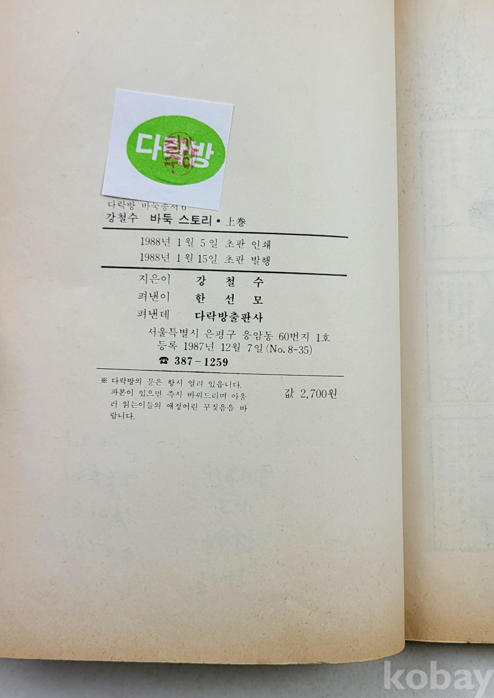 물 품 명 | 강철수 장편바둑극화 / 바둑스토리 (상) / 다락방바둑총서(6) / 1988년 초판 / 다락방출판사 |