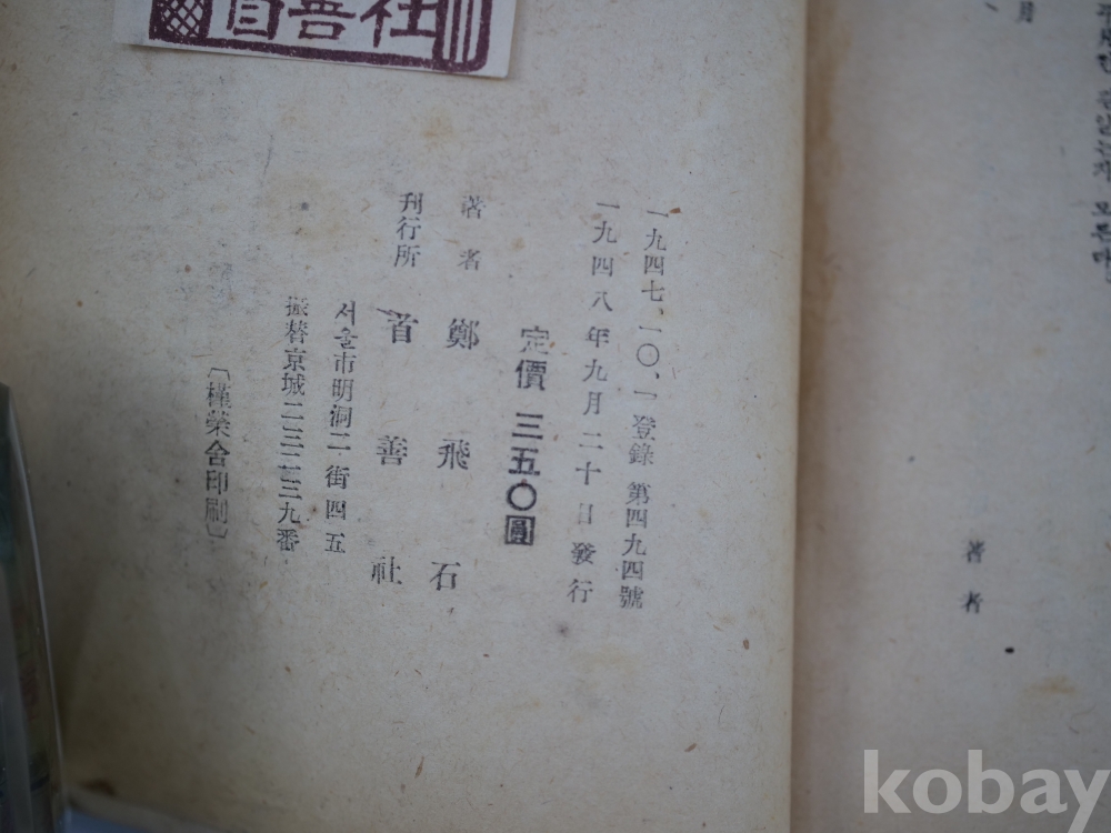 * 정비석/수선사/1948년(초판)/244쪽 판권지최상 |