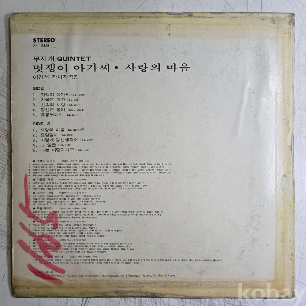 | 자켓상태 | VG : 주름, 접힘, 모서리 찢김 다수 | 음반상태 | VG : 생활 기스 다수, 가벼운 노이즈 존재 | 발매정보 | 초반 | 가사지여부 | 무 |