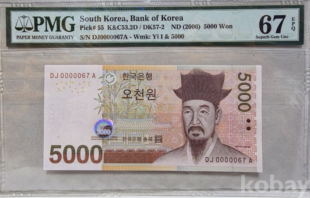 -대한민국 현행권 5000원 빠른번호 "67번" PMG 67 등급 입니다.
