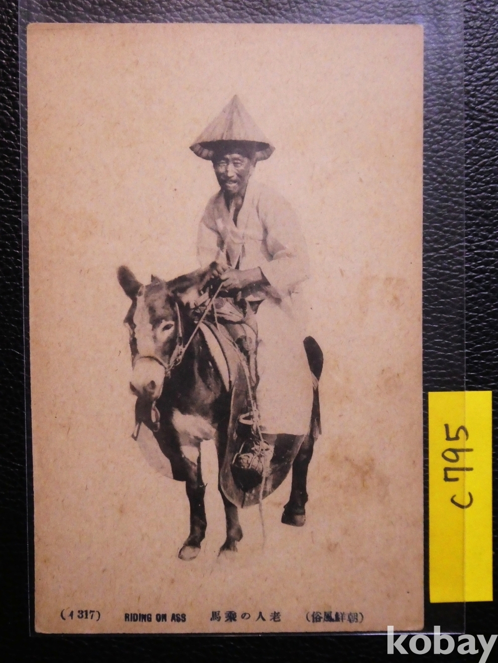▣한국근대엽서(진본): 노인의 승마, 노새를 탄 노인, 히노데상행/1매/역사자료, 일제시대, 일제강점기 사진엽서,그림엽서,회엽서. C795