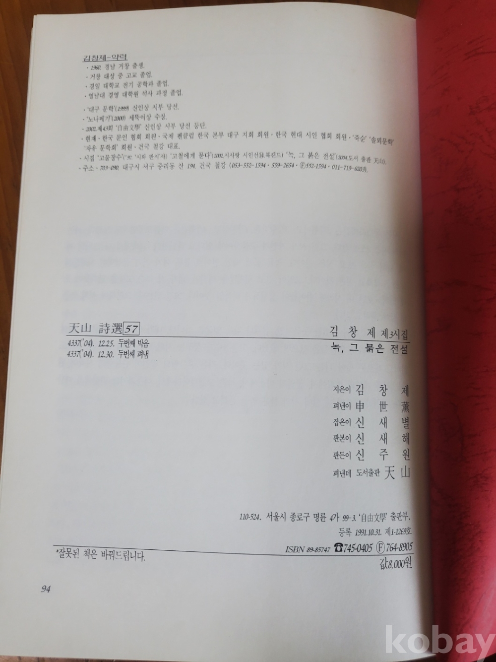 1. 녹 그 붉은 전설, 김창제, 도서출판 천산, 2004년, 93쪽, 상태 상, 사진 참조
