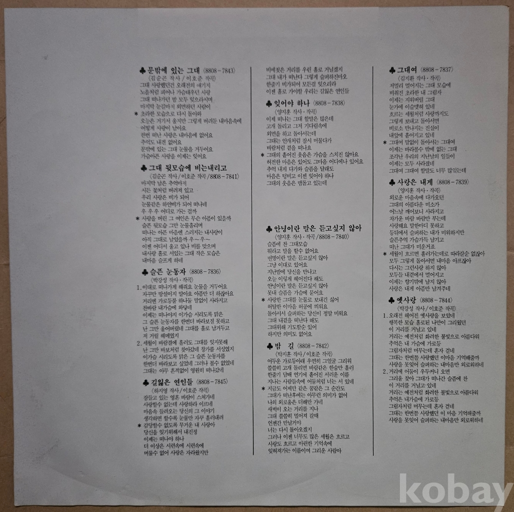 | 자켓상태 | EX : 약간의 마모, 모서리 찢김 존재 | 음반상태 | EX : 재생에 영향 없는 가벼운 기스 존재 | 발매정보 | 초반 | 가사지여부 | 유 |