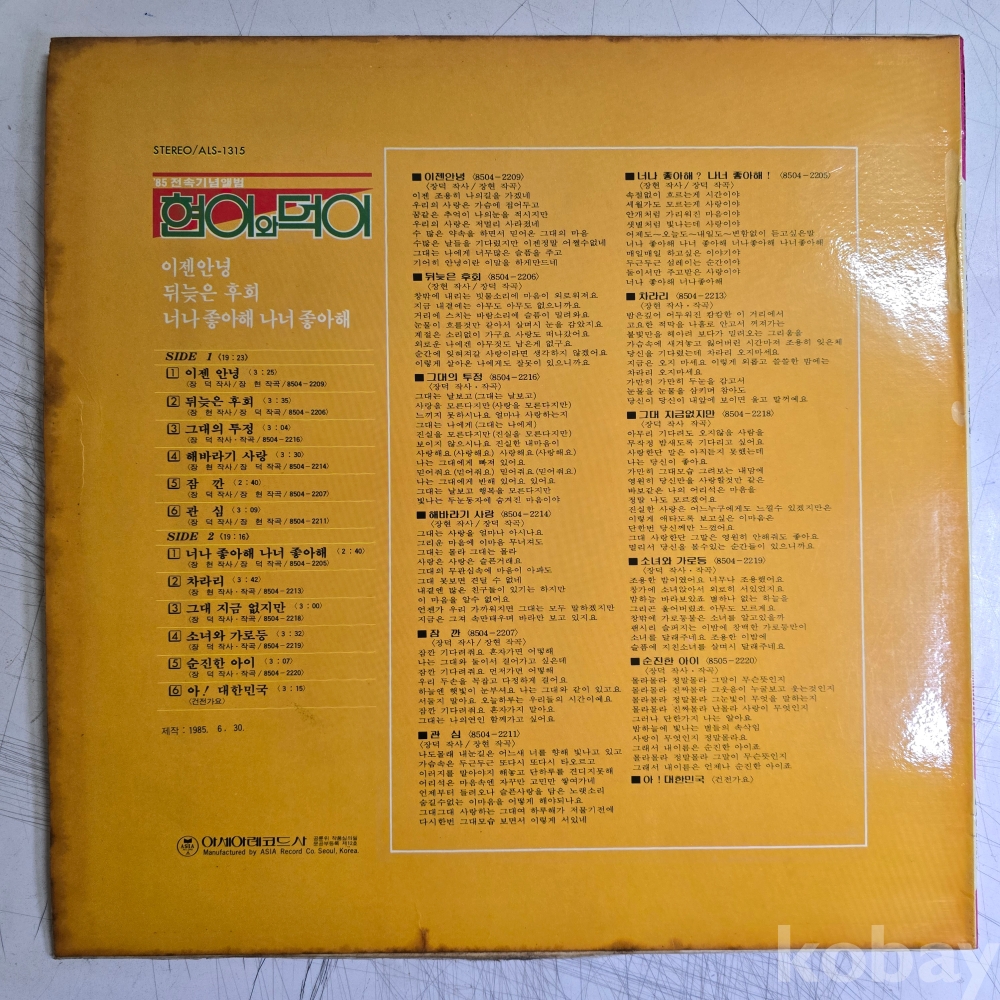 | 자켓상태 | VG : 주름, 접힘, 모서리 찢김 다수 | 음반상태 | VG : 생활 기스 다수, 가벼운 노이즈 존재 | 발매정보 | 초반 | 가사지여부 | 무 |