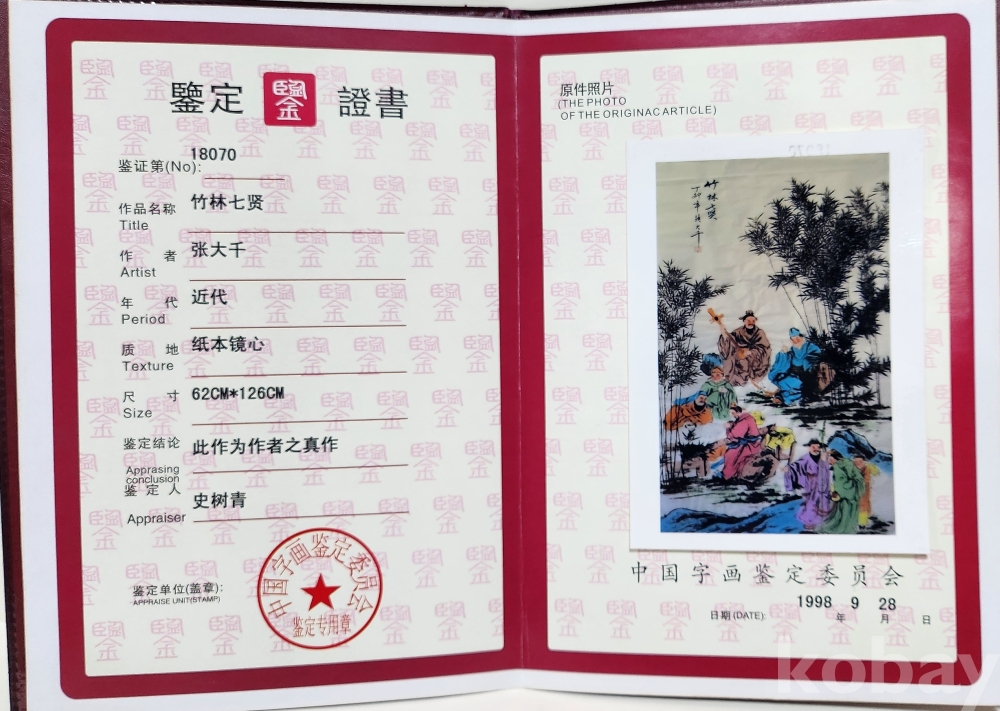 감정서(鑑定證書)가 함께하는 중국화가 장대천(張大千) 죽림칠선도(竹林七仙畵)입니다,