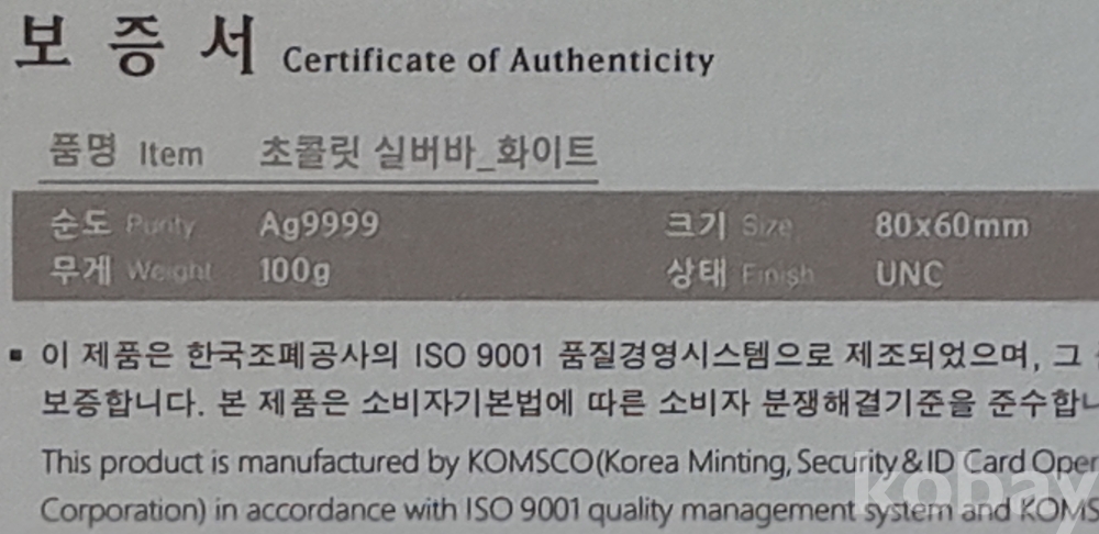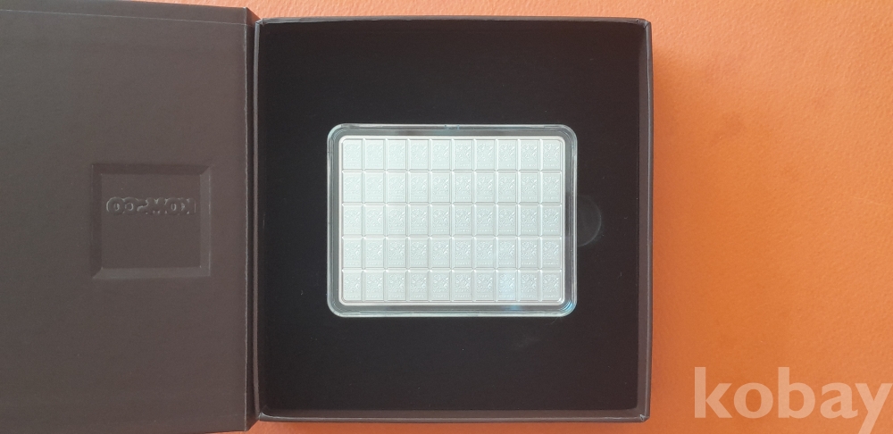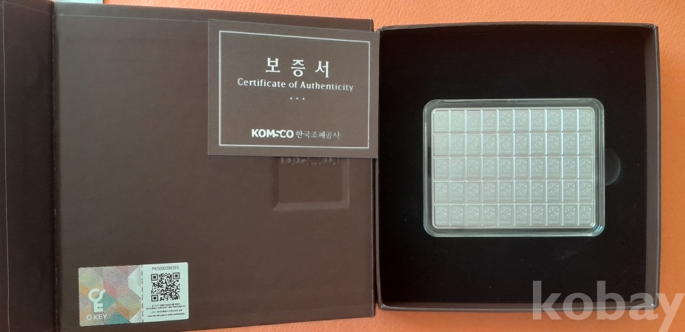 순도 Ag 9999, 무게 100 g , 크기 80*60 mm, 상태 UNC