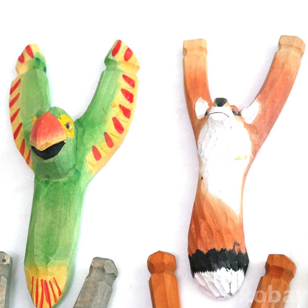 나무를 조각하여 만들어진 새총모양의 장식 8P 입니다.