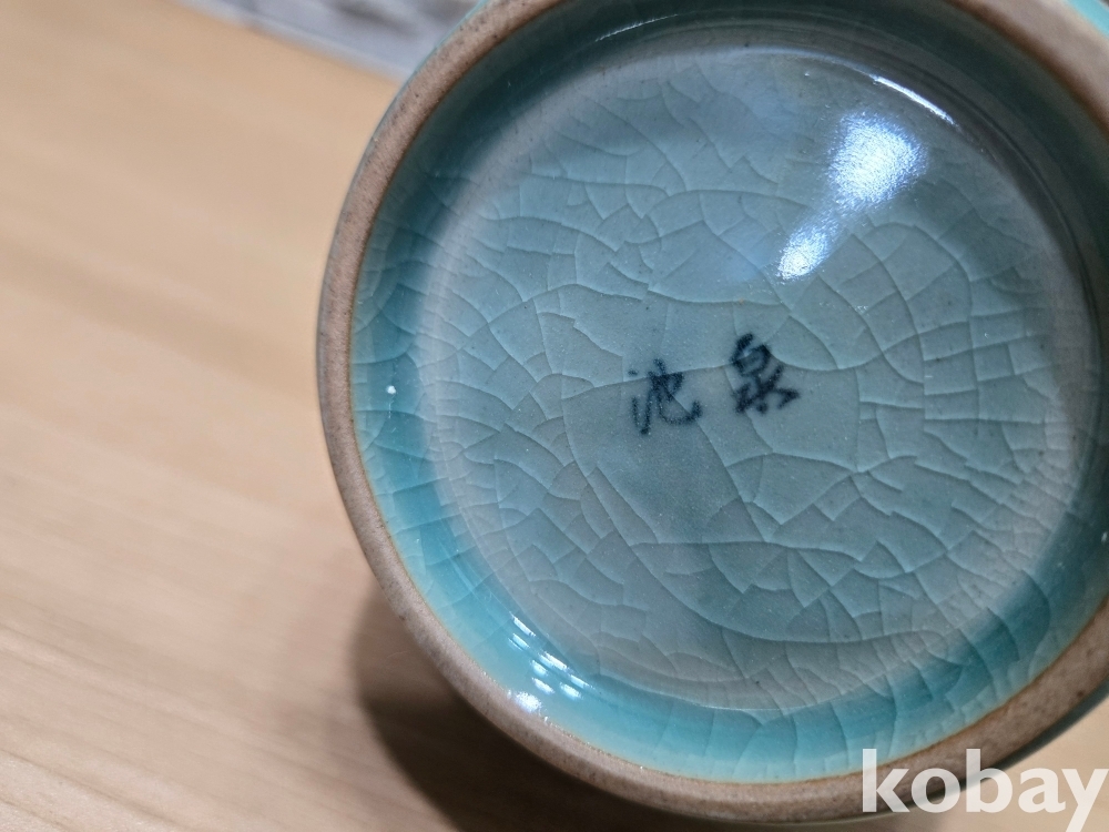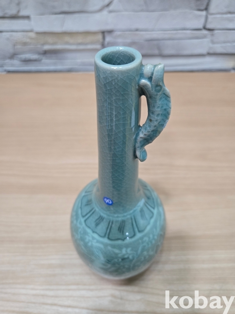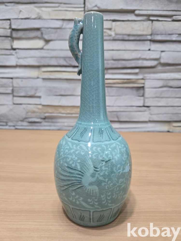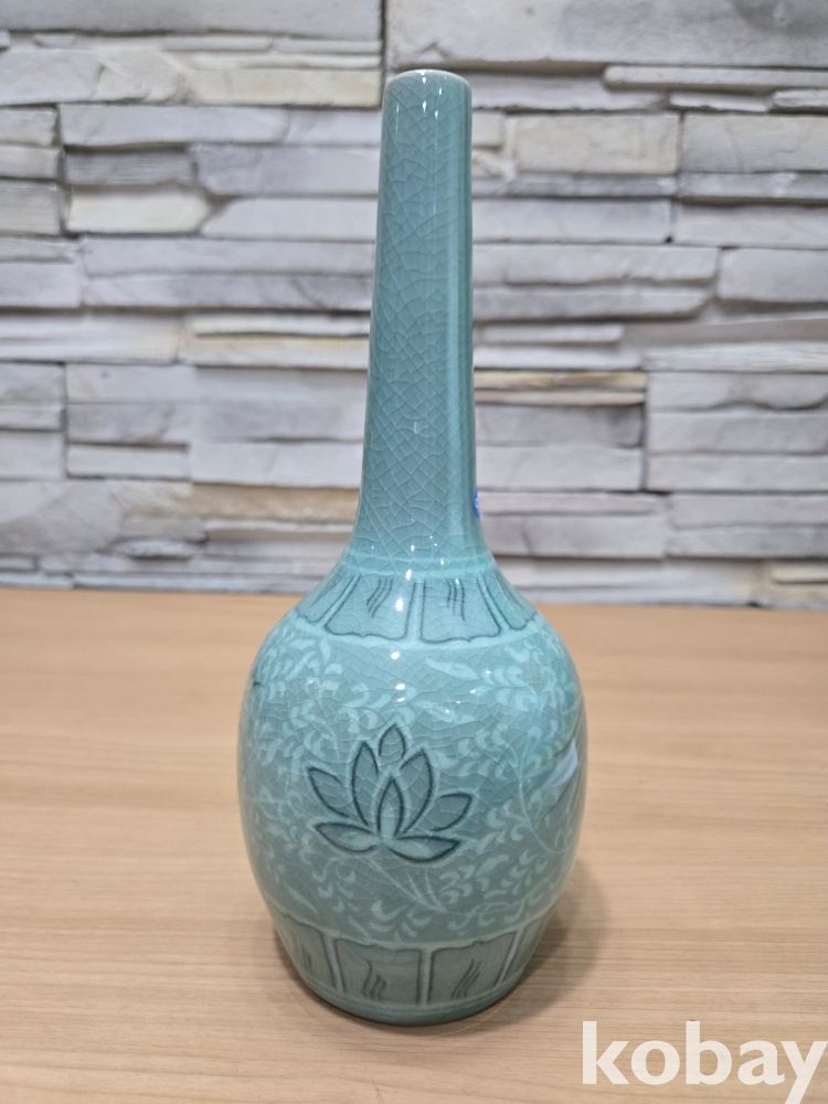 긴 목선에 물고기가 있는 청자 도자기 입니다.