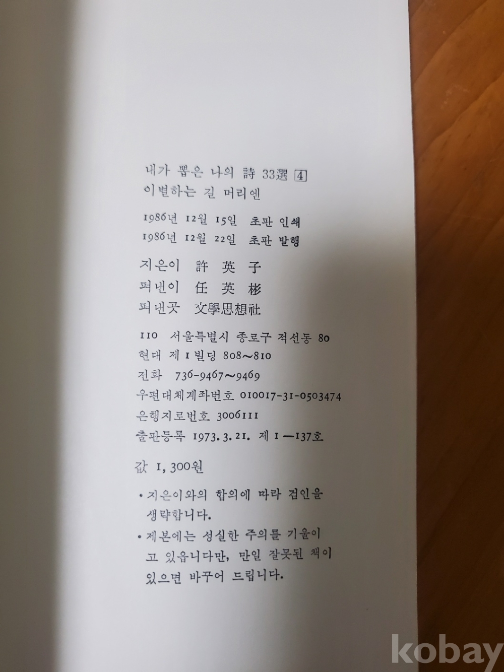 1. 이별하는 길머리엔, 허영자, 문학사상사, 1986년, 70쪽, 상태 상, 사진 참조