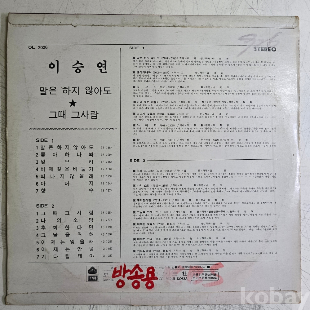 | 자켓상태 | VG : 주름, 접힘, 모서리 찢김 다수 | 음반상태 | VG : 생활 기스 다수, 가벼운 노이즈 존재 | 발매정보 | 초반 | 가사지여부 | 무 |