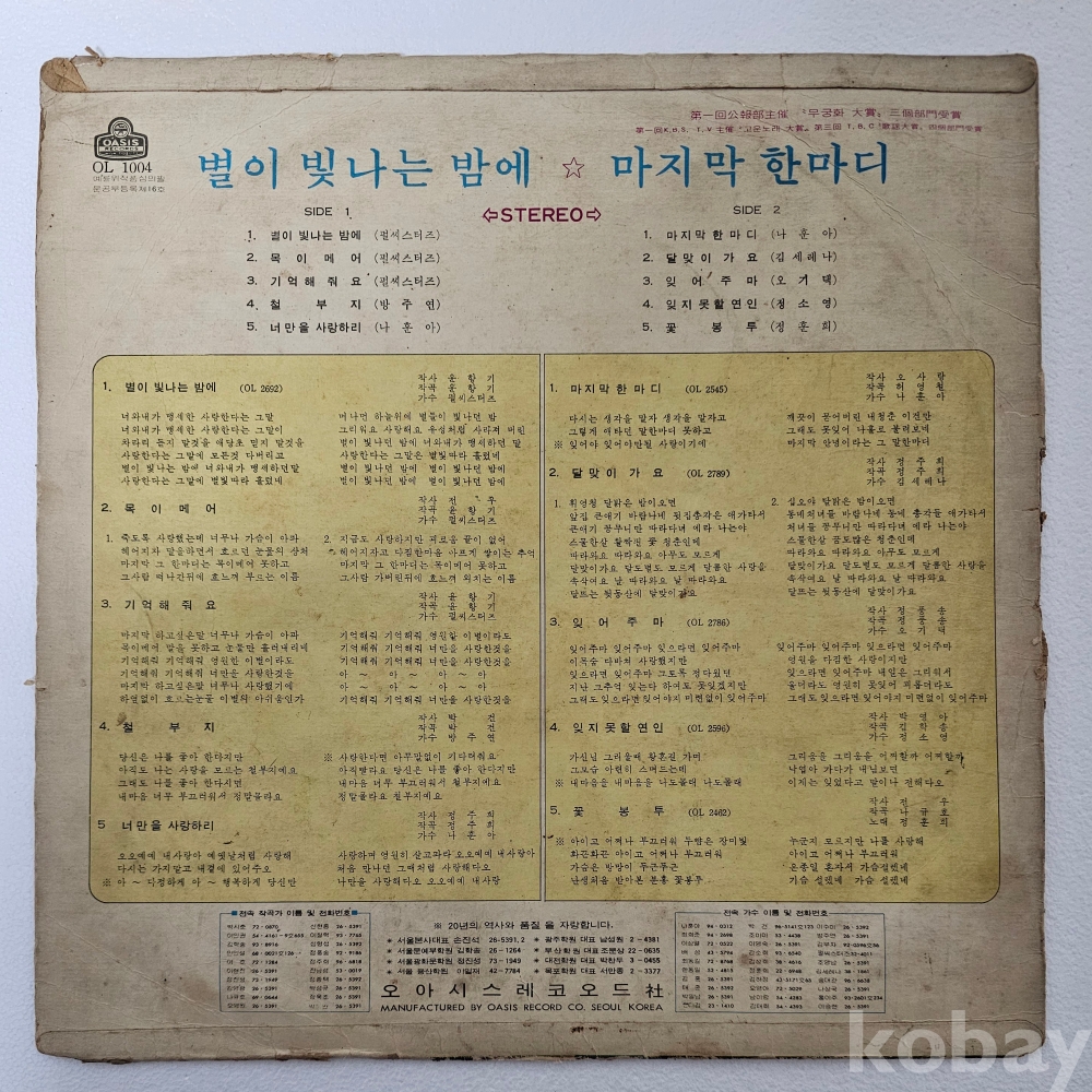 | 자켓상태 | VG : 주름, 접힘, 모서리 찢김 다수 | 음반상태 | VG : 생활 기스 다수, 가벼운 노이즈 존재 | 발매정보 | 초반 | 가사지여부 | 무 |