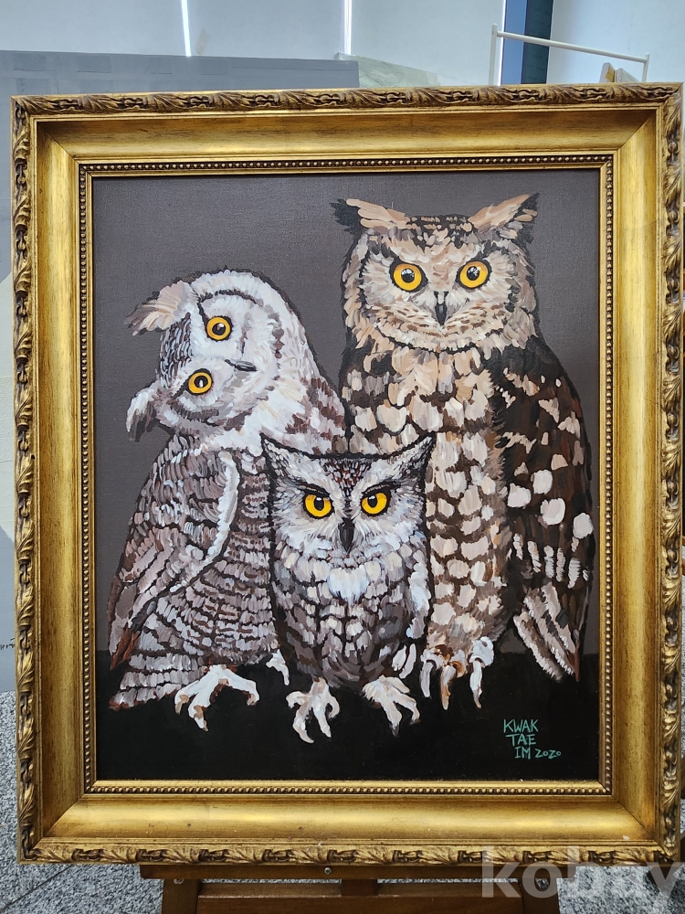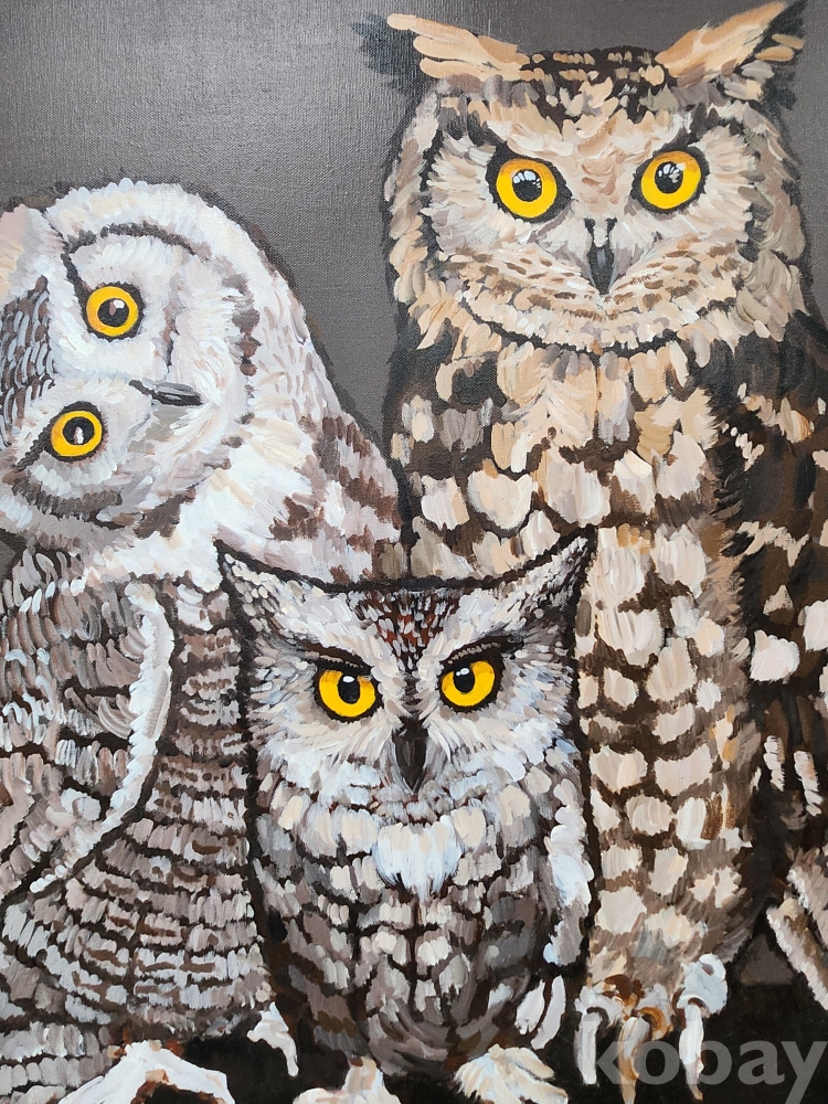검은 배경 위에 세 마리의 부엉이가 밀집된 구도로 배치돼 있으며, 각각 서로 다른 방향의 시선과 자세를 보이고 있다. 반복적인 붓 터치를 통해 깃털의 결이 표현돼 있고, 노란 눈동자가 어두운 화면과 대비를 이루며 화면의 집중도를 높인다. 동일한 소재의 반복 배치를 통해 안정적인 삼각 구도가 형성돼 있으며, 전체적으로 응집력 있는 화면 구성을 보여준다.