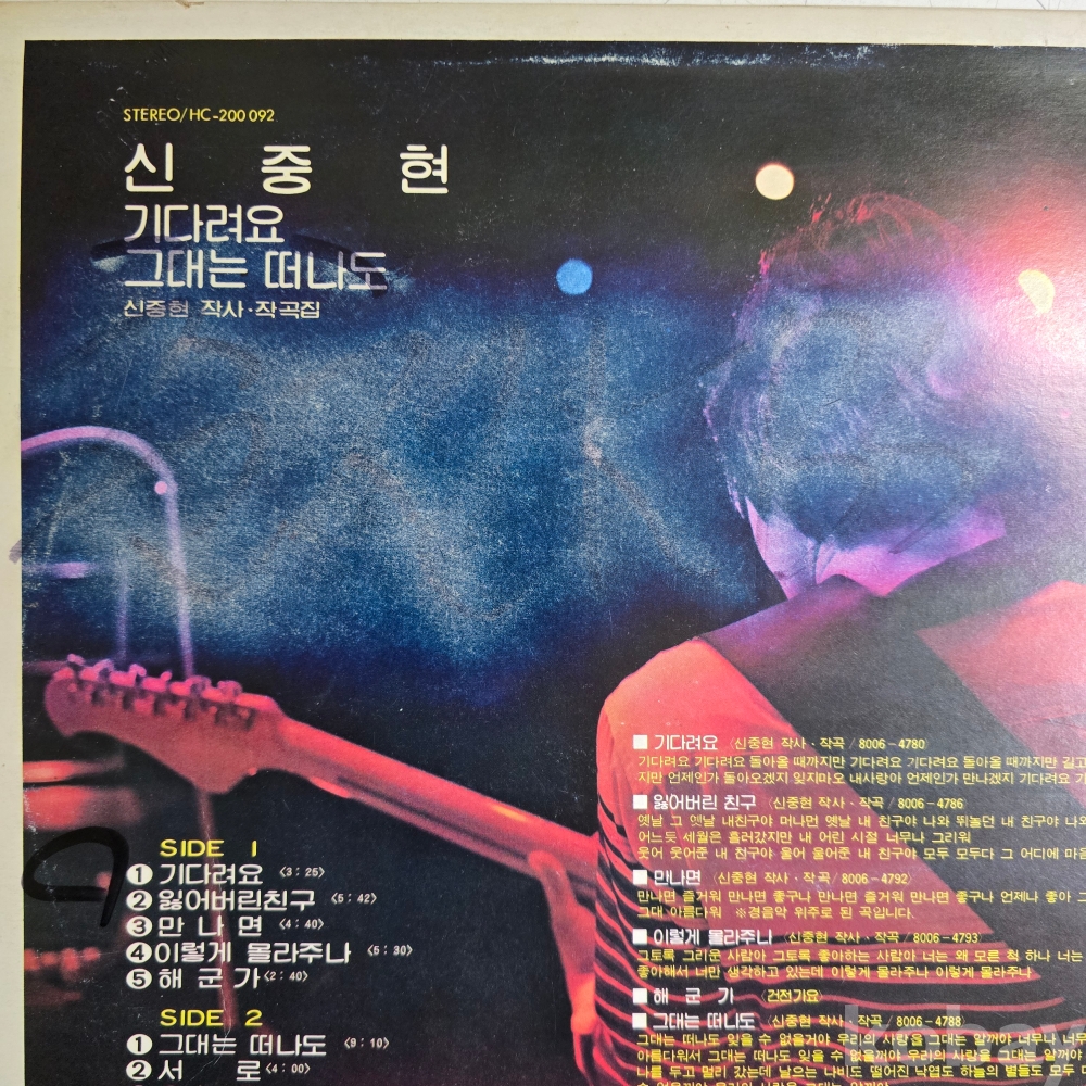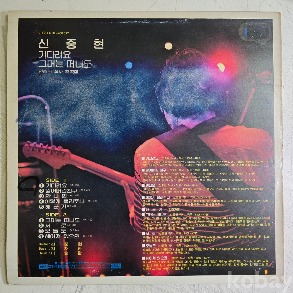 | 자켓상태 | VG : 주름, 접힘, 모서리 찢김 다수 | 음반상태 | VG : 생활 기스 다수, 가벼운 노이즈 존재 | 발매정보 | 초반 | 가사지여부 | 무 |