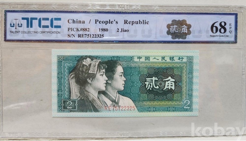-1980년 중국 인민은행 발행 2각 지폐 TCC68 고등급 입니다.