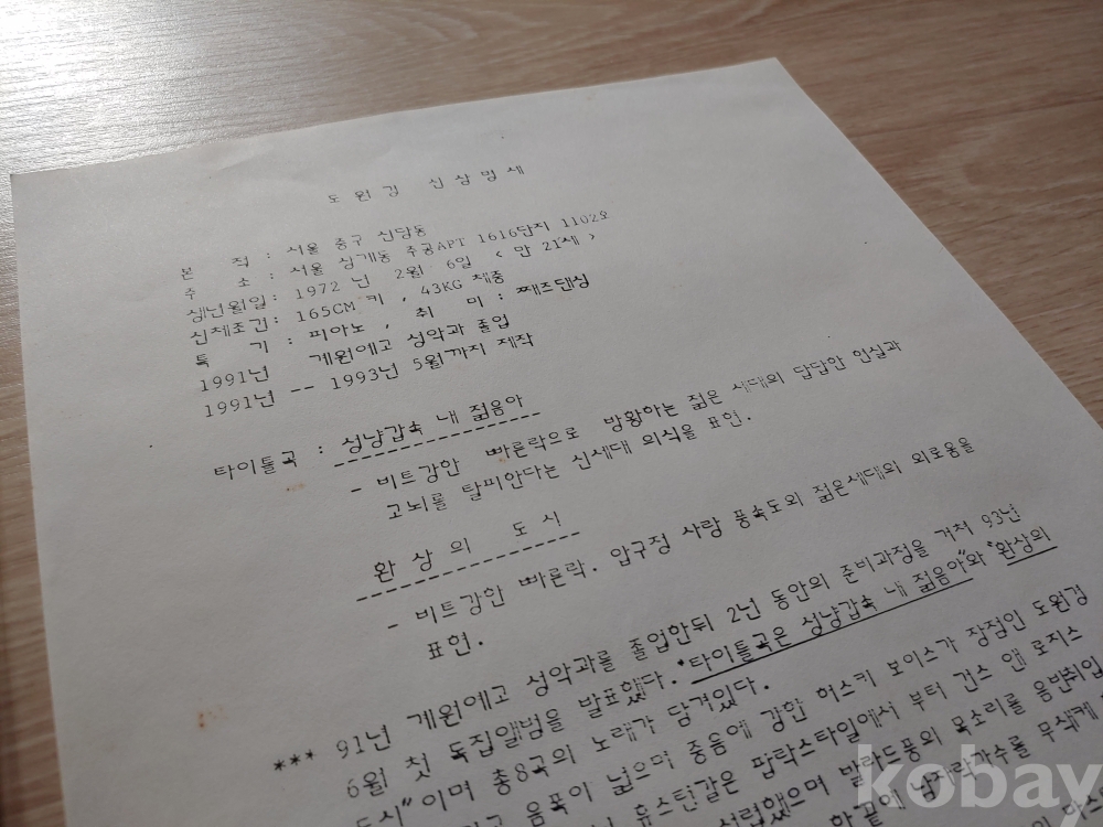 타자기로 찍어낸 도원경 프로필 인쇄물이 들어있음