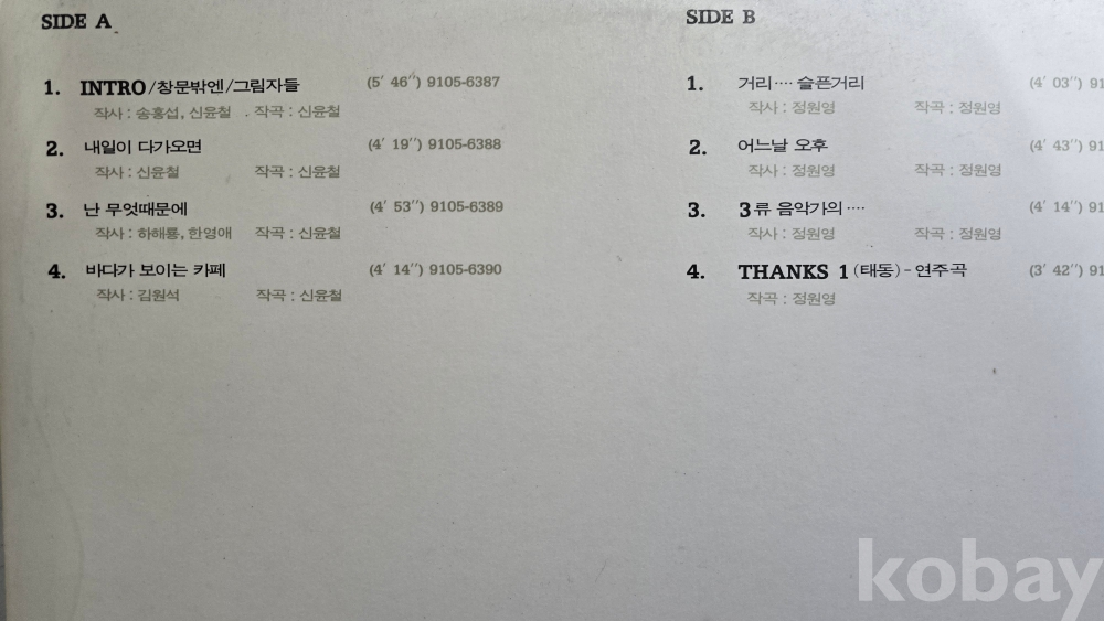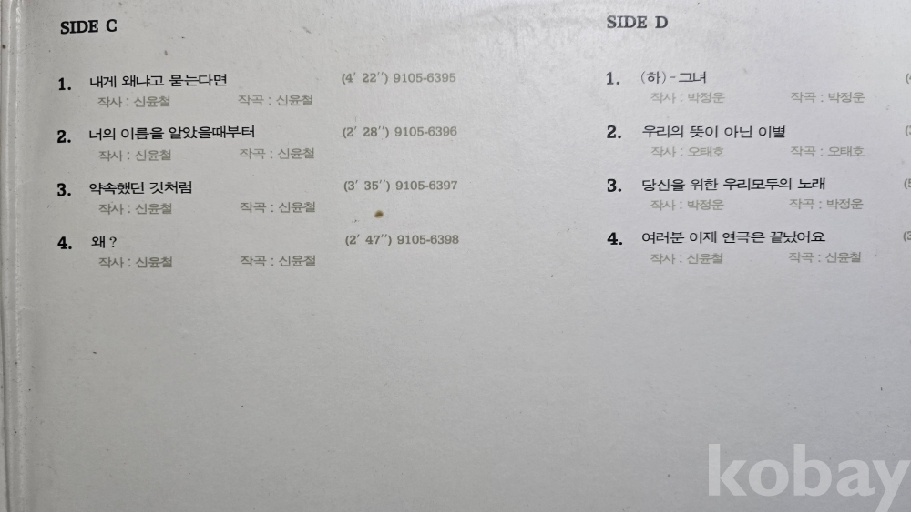 | 자켓상태 | VG : 주름, 접힘, 모서리 찢김 다수 | 음반상태 | VG : 생활 기스 다수, 가벼운 노이즈 존재 | 발매정보 | 초반 | 가사지여부 | 유 |