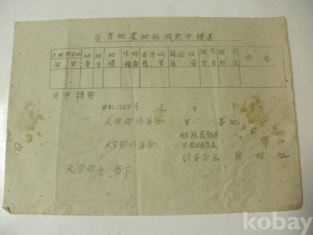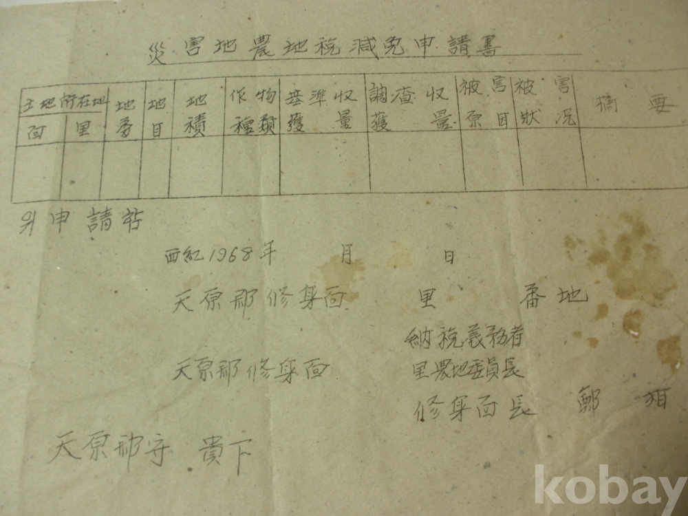 재해지 - 농지세 감면 신청서 (1968년, 천원군 수신면, 천원군수 귀하)