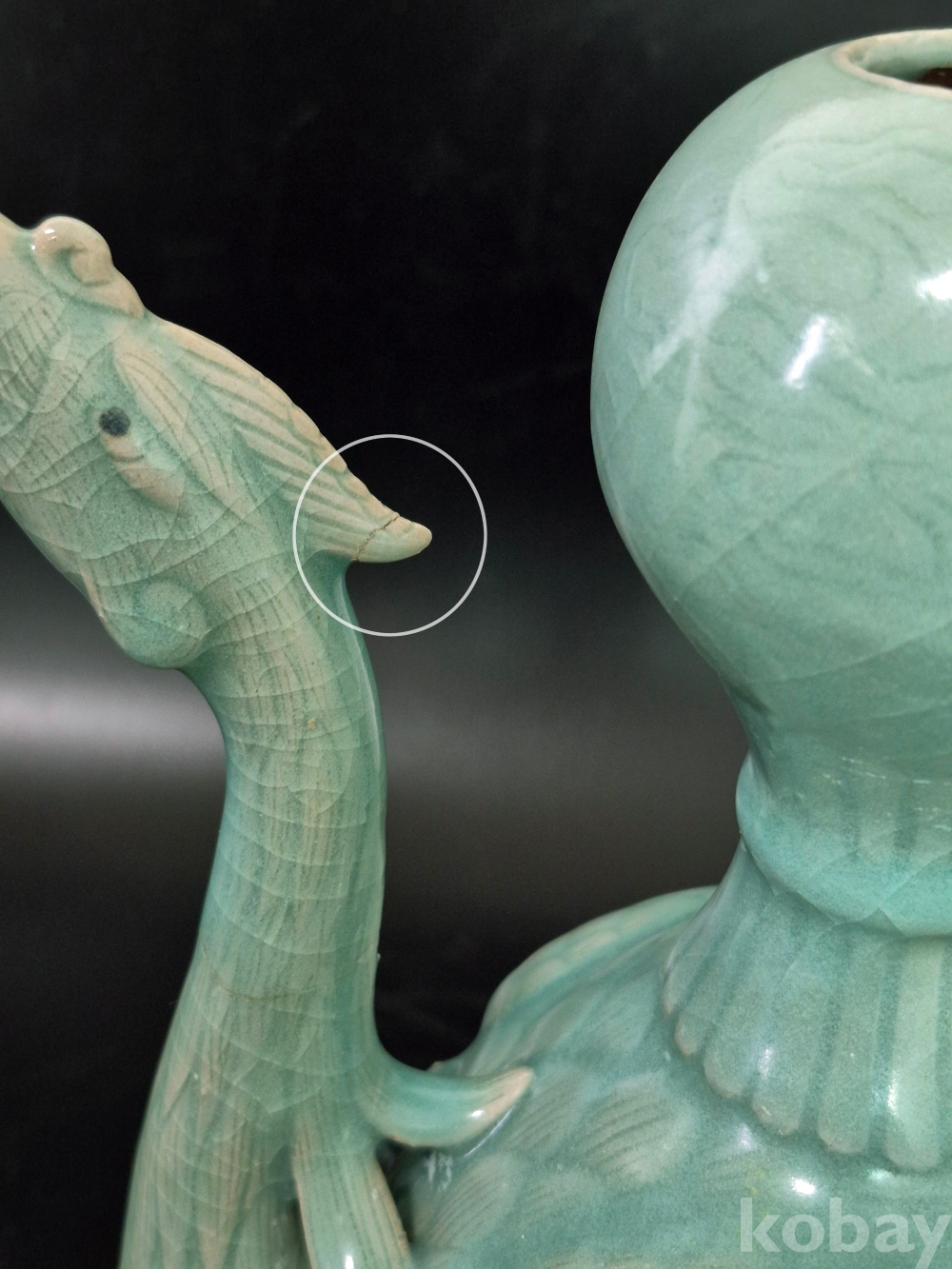 기물도 매우 크고 균형이 잡혀 있으며 유색 또한 일품입니다. 그런데 애석하게도 봉황의 목부분이 똑 부러져 수리를 해 놓았습니다. 안에 나무막대를 넣어 단단하게 고정후 접합해 놓아서 다시는 부러지지 않을 것입니다. 알고서 자세히 들여다 봐야만 보일만큼 티가 나지는 않습니다. 또한 봉황의 벼슬 끝이 쌀알만한 크기로 떨어진 것을 제살 붙임 해 놓았습니다.