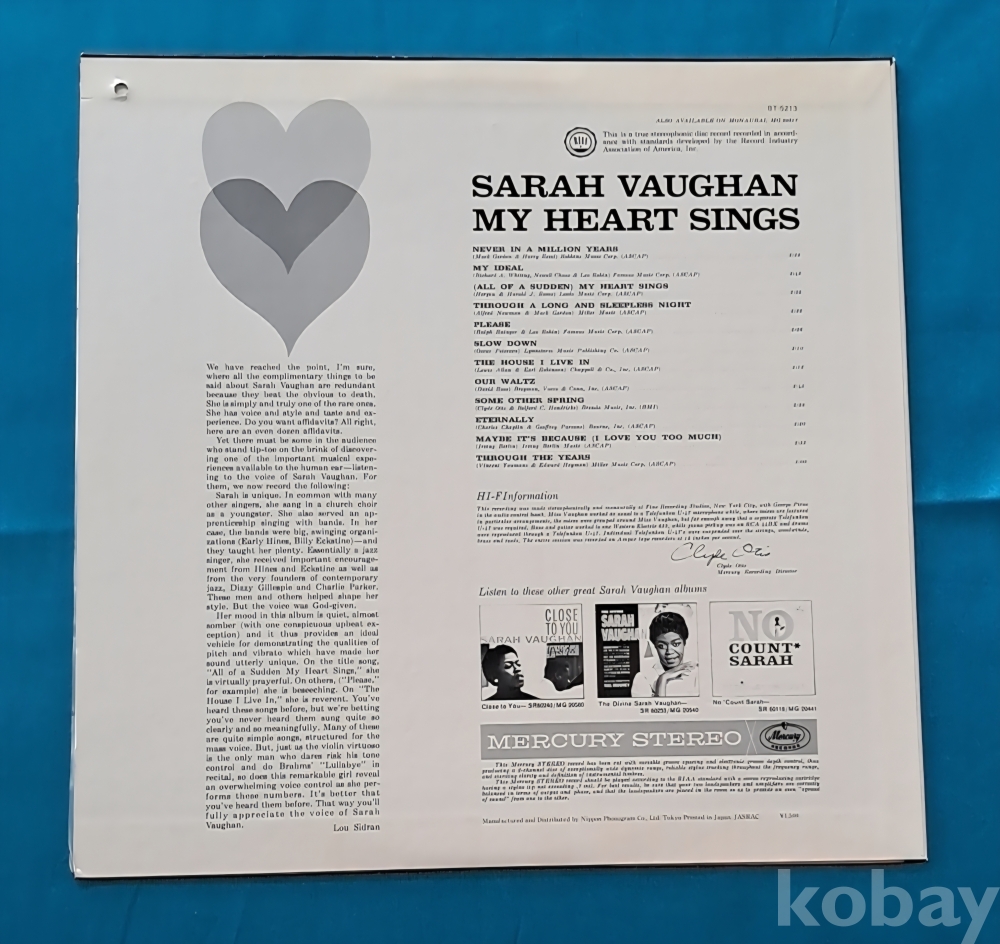 Sarah Vaughan의 1961년 재즈 앨범인 My Heart Sings LP 레코드입니다.