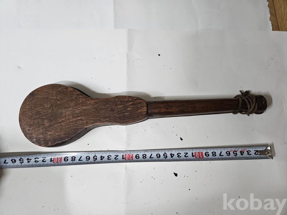 두 부재는 끈으로 묶여 있는 상태이며, 손잡이 끝부분이 독특하게 마감되어 있습니다.