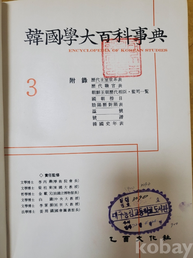 5. 한국학대배과사전 3(543쪽) : 역대왕실세계표 / 역대직관표 / 조선왕조역대상신 ․ 감사일람 / 국조방목 / 음약열대조표 / 시호 / 호보 / 한국사연표